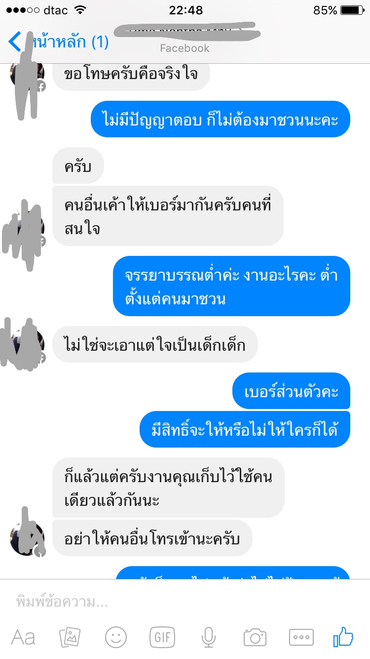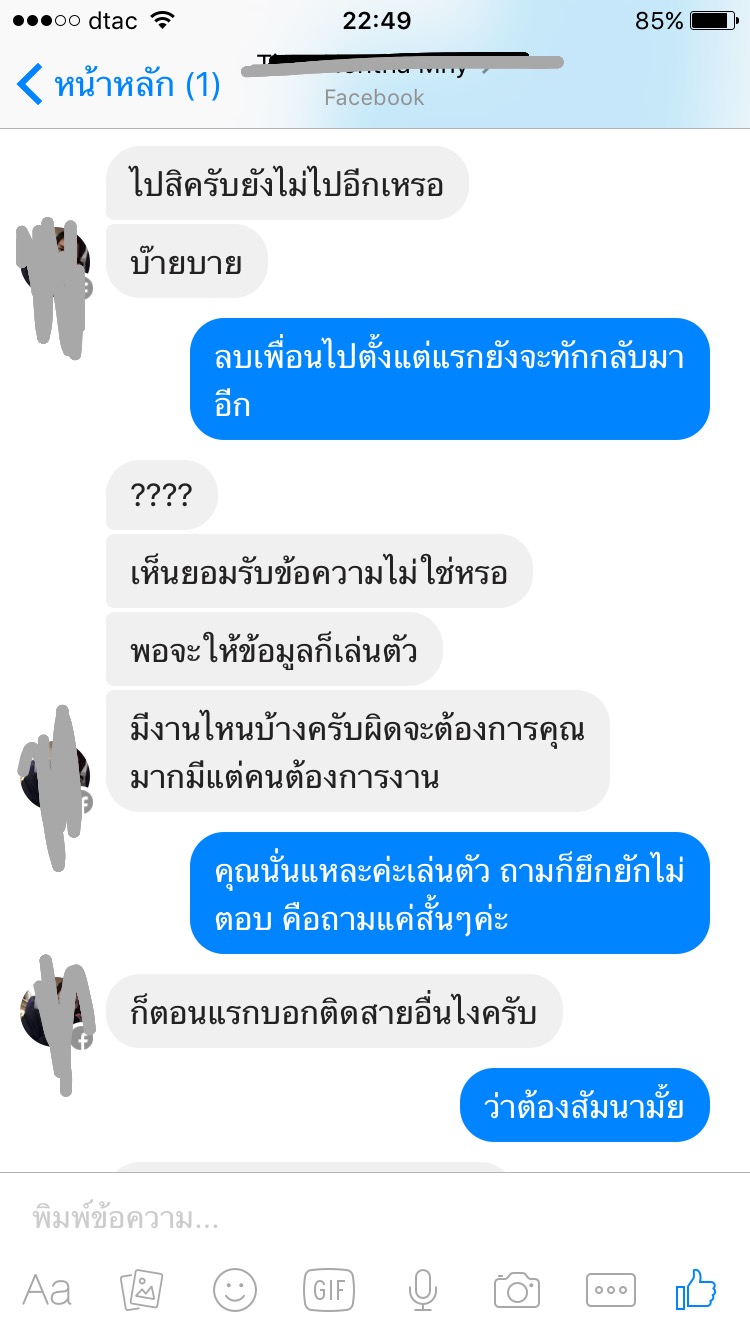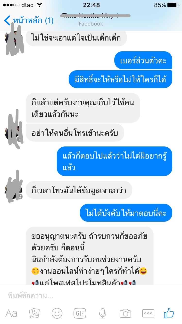 เรื่องราวของเราเรียกว่าเป็นประสบการณ์ตัวอย่างนะคะ จะเล่าถึงสิ่งที่เจอมา ส่วนใครจะว่าดีหรือคนอื่นดีก็ บลาๆๆ แล้วแต่คุณค่ะ แต่นี่คือสิ่งที่เราเจอ และอยากจะแชร์ประสบการณ์ อันน่าขยะแขยงนี้ เราเจอบุคคลนึงในเฟสบุ๊ค เป็นผช ไม่ได้รู้จักเป็นการส่วนตัวแต่ว่าเป็นเพื่อนในเฟส โดยมาชวนเราทางแชท ก็จะเป็นแพทเทิร์นเดิมๆ ทำงานในเน็ต2-3 ชม.ต่อวัน ได้เงินเดือนเป็นหมื่น บลาๆๆๆ นั่นแหละ เราถามเค้าว่าต้องไปฟังสัมนามั้ย ซึ่งเค้าไม่ยอมตอบเราโดยตรงถามย้อนเรากลับ นู่นนั่นนี่ อยู่จังหวัดไหน ขอเบอร์เรา เราไม่ให้ค่ะซึ่งมันก็เป็นสิทธิ์ของเรา คือเค้าไม่ยอมตอบที่เราถามค่ะจะขอเบอร์ลูกเดียว คำถามที่เราถามก็ง่ายๆสั้นๆ เพียงตอบมาว่าไปหรือไม่ มันยากนักหรอ ไม่ยอมตอบค่ะ เราเลยตอบกลับไปว่าไม่อยากรู้แล้ว เท่านั้นเองนางเลยเกิดอาการเมนส์มาค่ะ ตามภาพการสนทนาดังต่อไปนี้ (แต่บอกก่อนค่ะว่ามีข้อมูลแค่ส่วนเดียว เพราะช่วงต้นที่เราตอบกลับว่าไม่อยากรู้ข้อมูลแล้ว เราก็เข้าไปลบเพื่อน และลบข้อความสนทนาค่ะ ก็ไม่นึกเหมือนกันว่านางจะตอบกลับด้วยคำพูด dogๆ แบบนี้ เลยทำให้มีข้อความเท่านี้นะคะขออภัย)