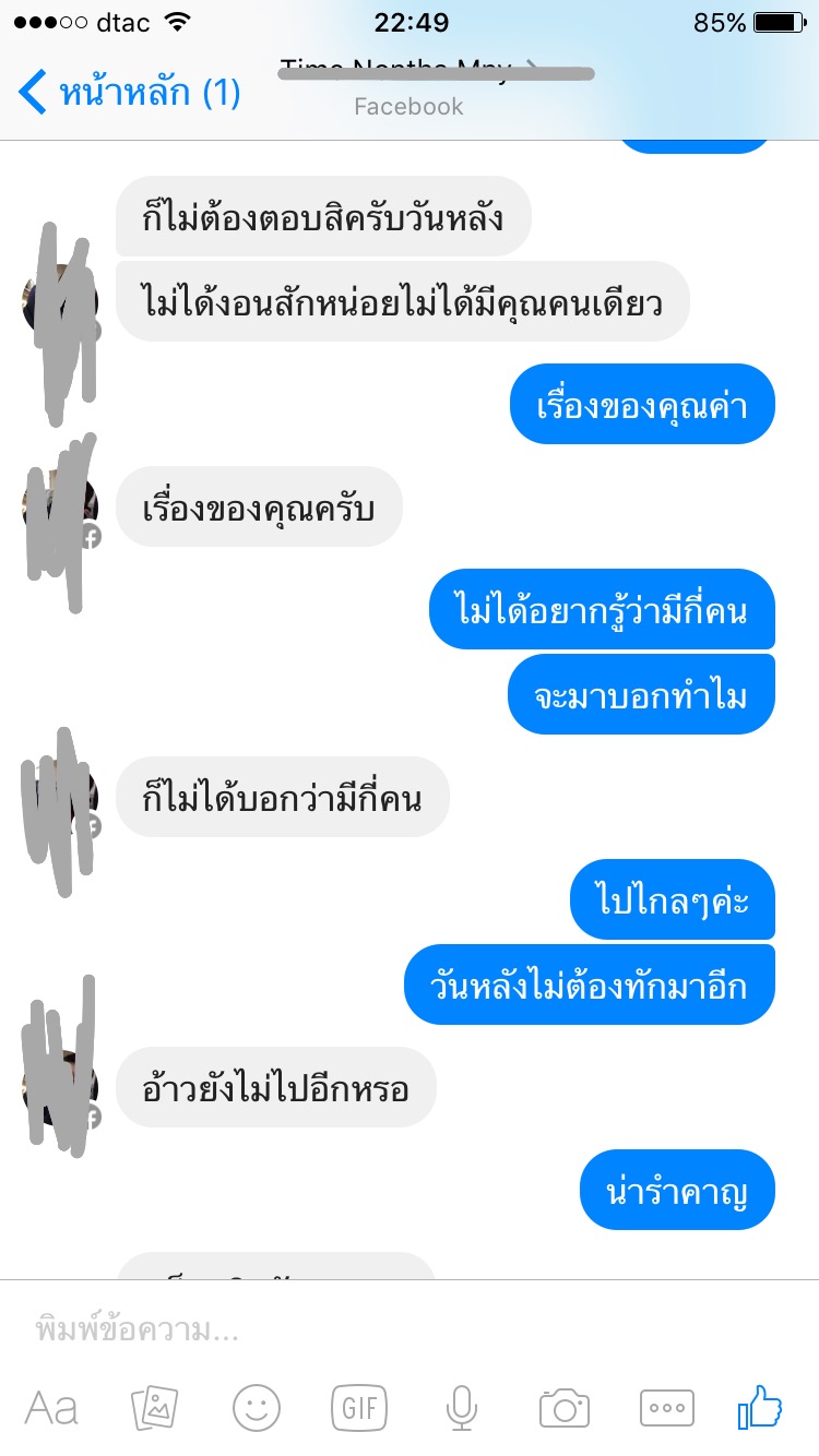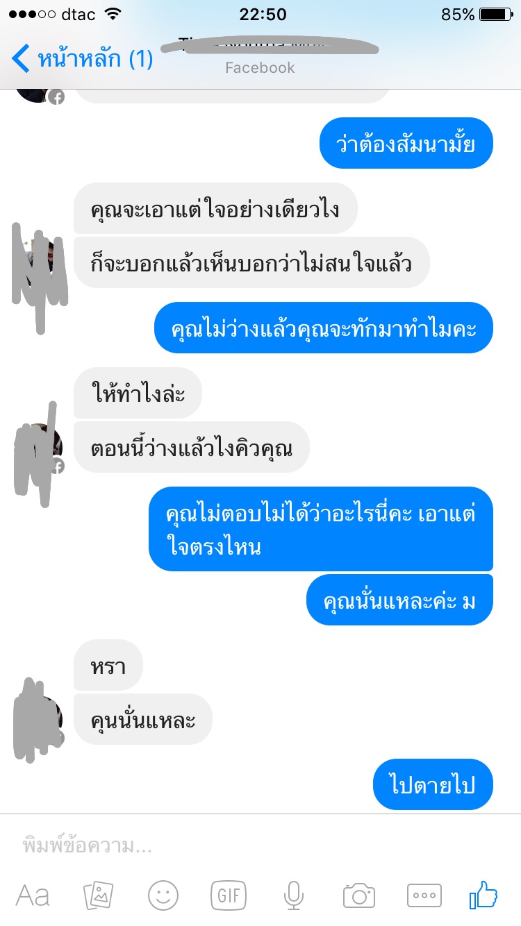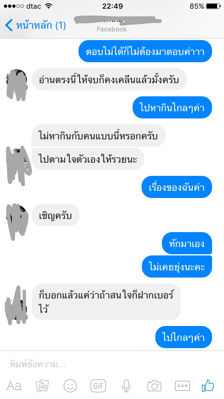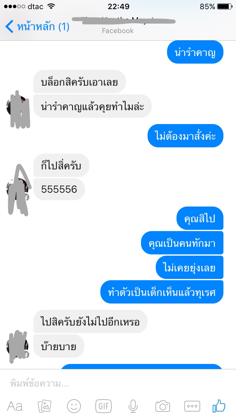 เรื่องราวของเราเรียกว่าเป็นประสบการณ์ตัวอย่างนะคะ จะเล่าถึงสิ่งที่เจอมา ส่วนใครจะว่าดีหรือคนอื่นดีก็ บลาๆๆ แล้วแต่คุณค่ะ แต่นี่คือสิ่งที่เราเจอ และอยากจะแชร์ประสบการณ์ อันน่าขยะแขยงนี้ เราเจอบุคคลนึงในเฟสบุ๊ค เป็นผช ไม่ได้รู้จักเป็นการส่วนตัวแต่ว่าเป็นเพื่อนในเฟส โดยมาชวนเราทางแชท ก็จะเป็นแพทเทิร์นเดิมๆ ทำงานในเน็ต2-3 ชม.ต่อวัน ได้เงินเดือนเป็นหมื่น บลาๆๆๆ นั่นแหละ เราถามเค้าว่าต้องไปฟังสัมนามั้ย ซึ่งเค้าไม่ยอมตอบเราโดยตรงถามย้อนเรากลับ นู่นนั่นนี่ อยู่จังหวัดไหน ขอเบอร์เรา เราไม่ให้ค่ะซึ่งมันก็เป็นสิทธิ์ของเรา คือเค้าไม่ยอมตอบที่เราถามค่ะจะขอเบอร์ลูกเดียว คำถามที่เราถามก็ง่ายๆสั้นๆ เพียงตอบมาว่าไปหรือไม่ มันยากนักหรอ ไม่ยอมตอบค่ะ เราเลยตอบกลับไปว่าไม่อยากรู้แล้ว เท่านั้นเองนางเลยเกิดอาการเมนส์มาค่ะ ตามภาพการสนทนาดังต่อไปนี้ (แต่บอกก่อนค่ะว่ามีข้อมูลแค่ส่วนเดียว เพราะช่วงต้นที่เราตอบกลับว่าไม่อยากรู้ข้อมูลแล้ว เราก็เข้าไปลบเพื่อน และลบข้อความสนทนาค่ะ ก็ไม่นึกเหมือนกันว่านางจะตอบกลับด้วยคำพูด dogๆ แบบนี้ เลยทำให้มีข้อความเท่านี้นะคะขออภัย)