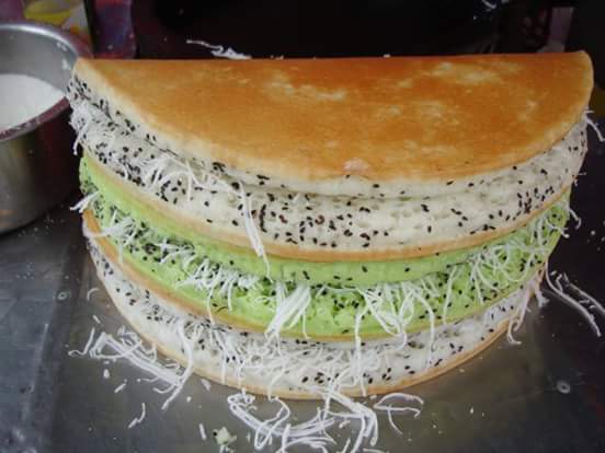 3. ทาน้ำมันที่กระทะ ตั้งไฟจนร้อนจัดแล้วลดไฟลง ตักแป้ง (ประมาณ 1/2 ถ้วยตวง) ใส่กระทะเหล็ก พอแป้งเริ่มสุก จึงโรยน้ำตาลทราย (ตามความหวานที่ชอบ), งา และมะพร้าวขูด แซะพับครึ่งแล้วตักขึ้นใส่จานเสริฟ
