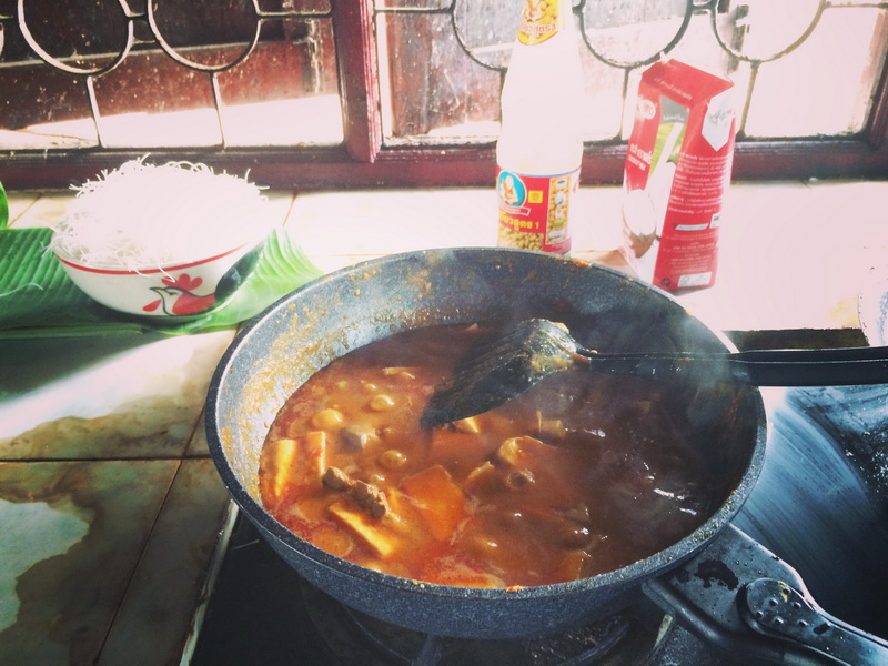 กะทิงวดไปนิดนึง เติมเพิ่มที่เหลือ ประมาณ 250 มล. ค่ะ คนเบาๆ อีกซักสองสามนาที เล็งดูให้เครื่องในไก่สุก ก็เอาเส้นหมี่ลงได้เลย