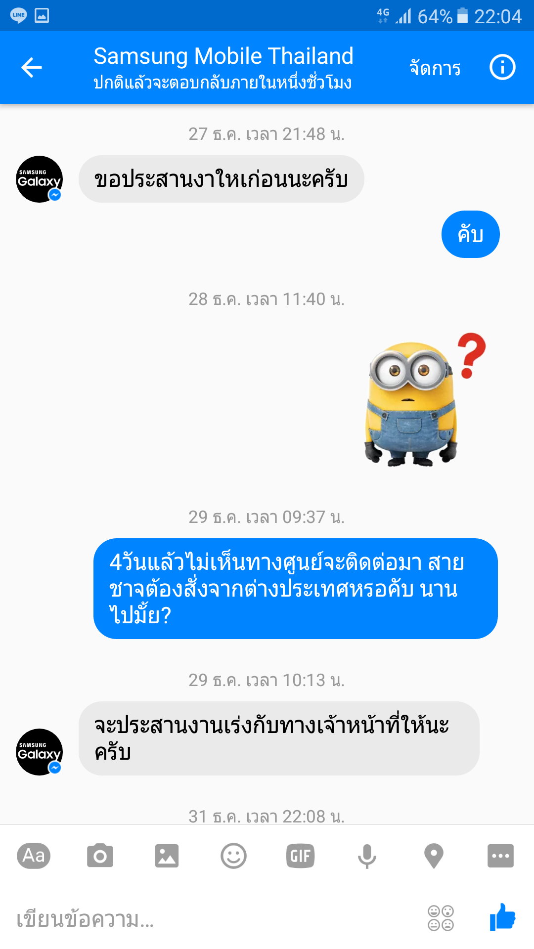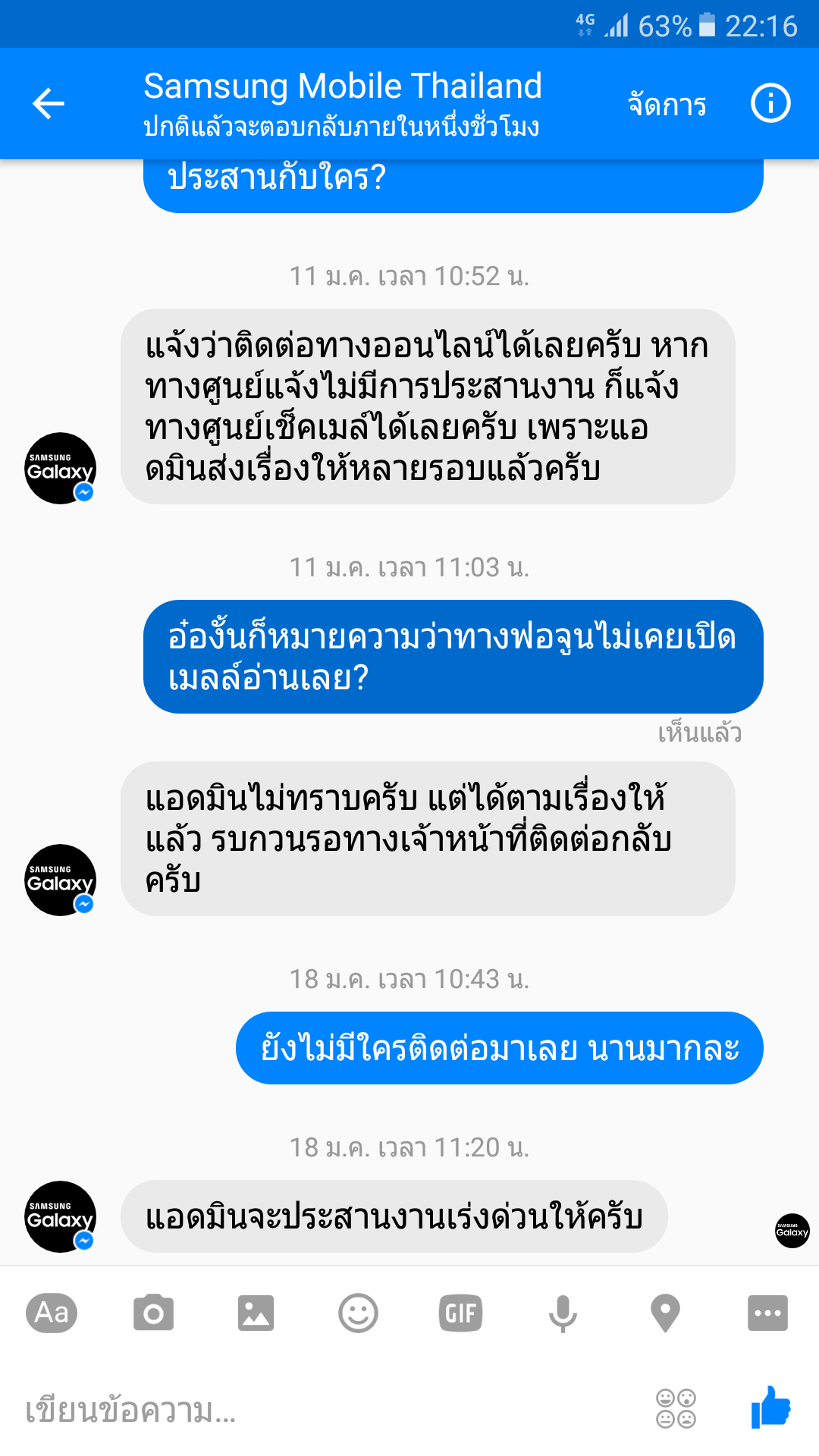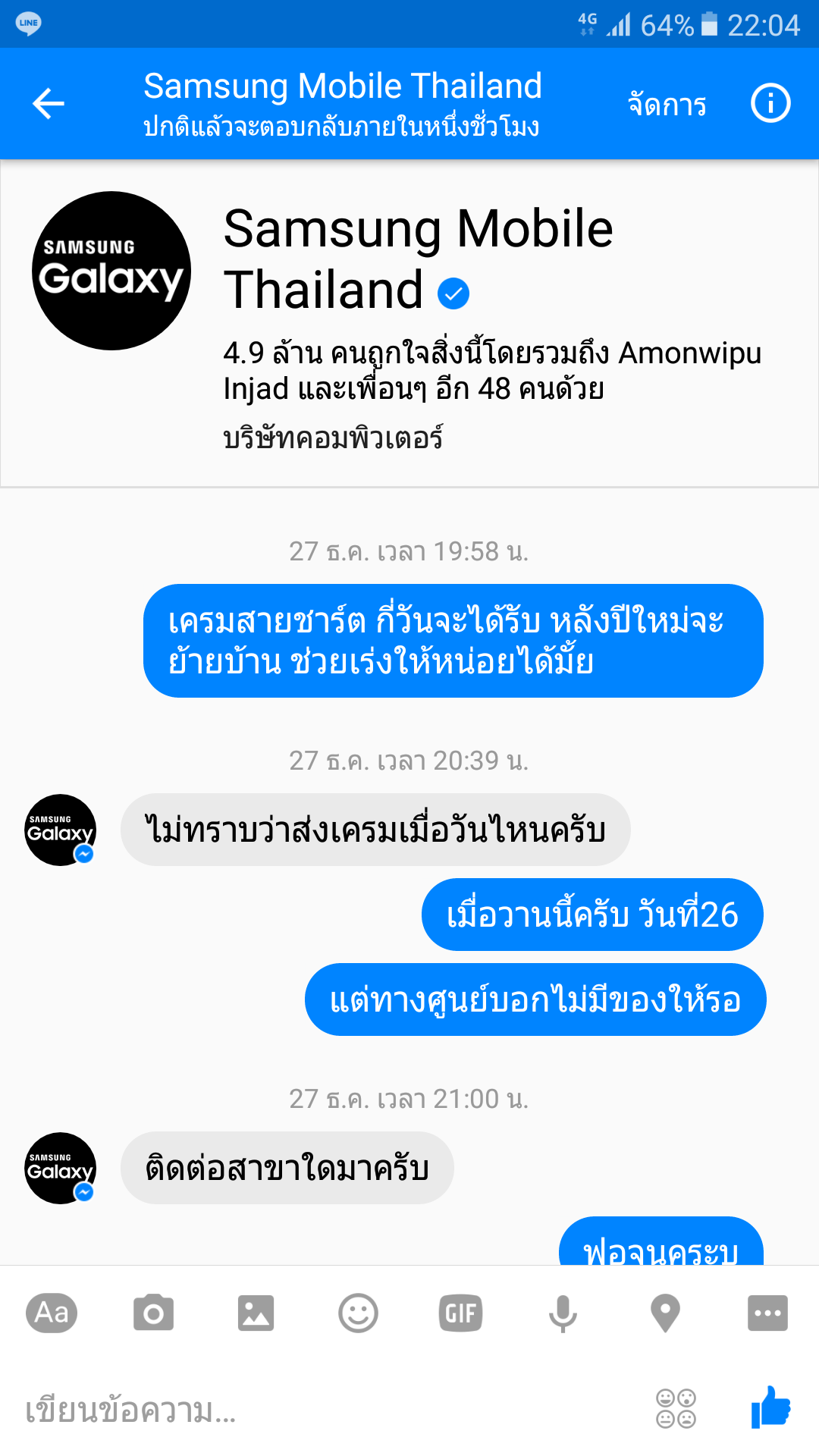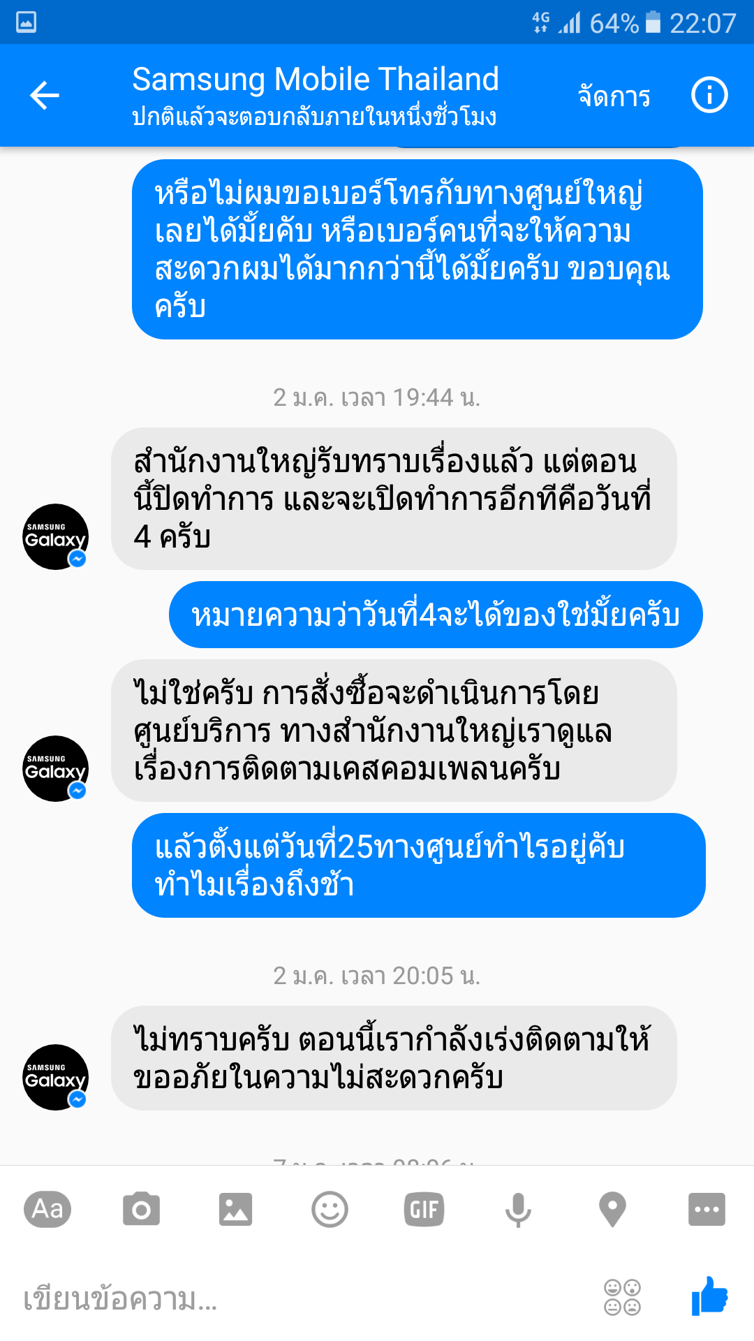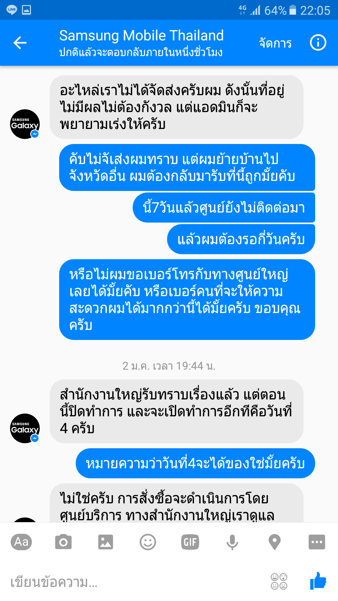 ผม. คุณโทมาบอกผมว่าของอยู่วันสุดท้ายตอนนี้ ผมเครมเรื่องไปตั้งแต่25ธันวา60คุณทำอะไรกันอยู่ ผมทราบว่าของถึงนานแล้วและประสานให้ส่งไปที่ศรีนครินทร์ แต่ที่ศรีนคริทร์ก็บอกไม่ทราบเรื่องคืออะไร นี้เดือนกว่าแล้ว