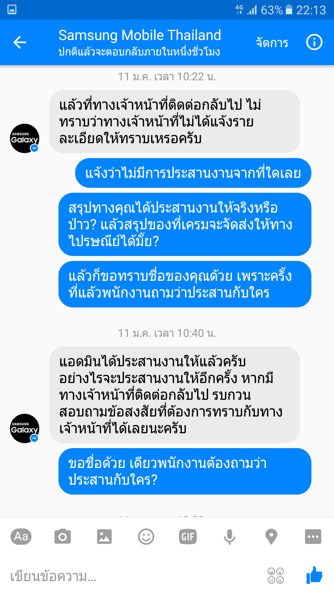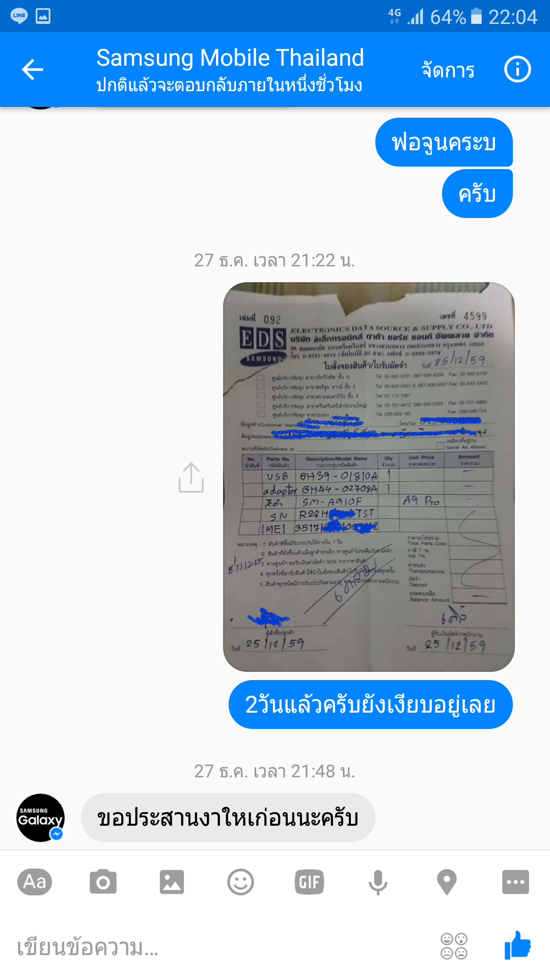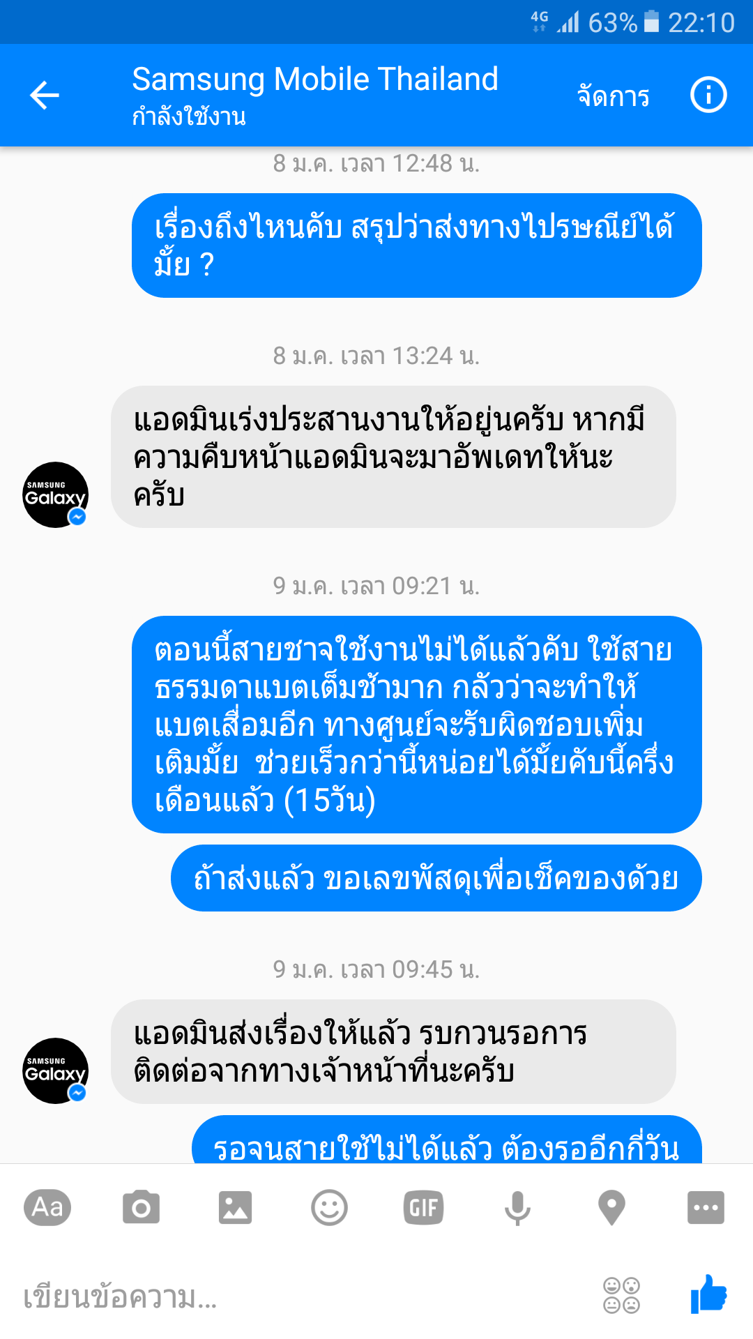 เรื่องมีอยู่ว่าสายชาร์จ A9 Pro แตกก็ไปเครมพนักงานก็เช็คเครื่องแล้วออกใบเครมให้ปกติ ลงวันที่ 25/12/59 แต่คุยกับพนักงานที่รับเรื่องเครมบอกว่าผมจะย้ายไปอยู่ ตจว วันที่ 05/01/60 พนักงานบอกทันคับ2-3วัน ก็โอเครไม่มีปัญหาเรารอ 2วันผ่านไป คือวันที่ 27/12/59 เริ่มตามเรื่องจาก facebook fanpage SS หลังจากนั้นก็ตามภาพ มีการติดต่อกับ page เป็นระยะ