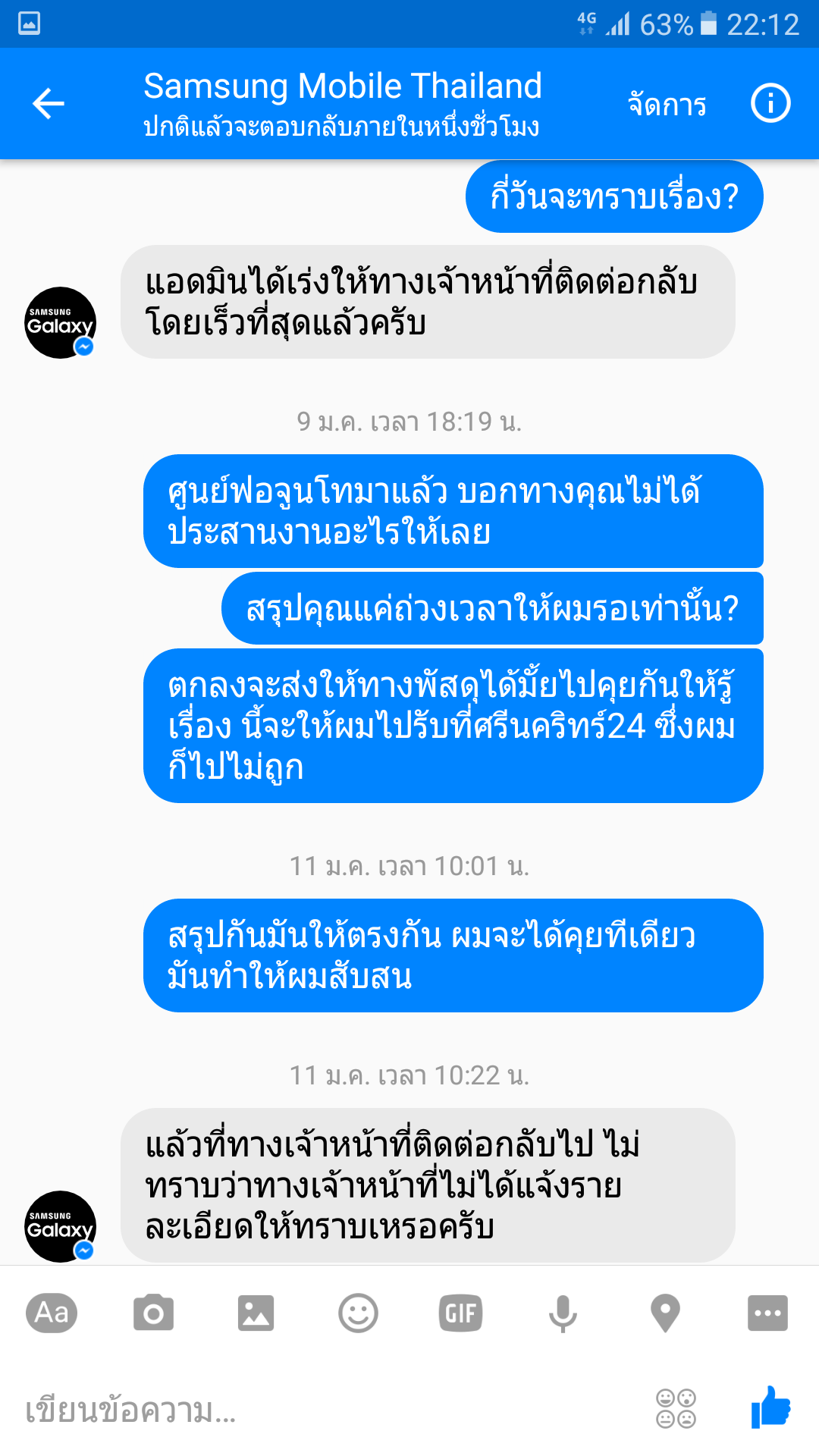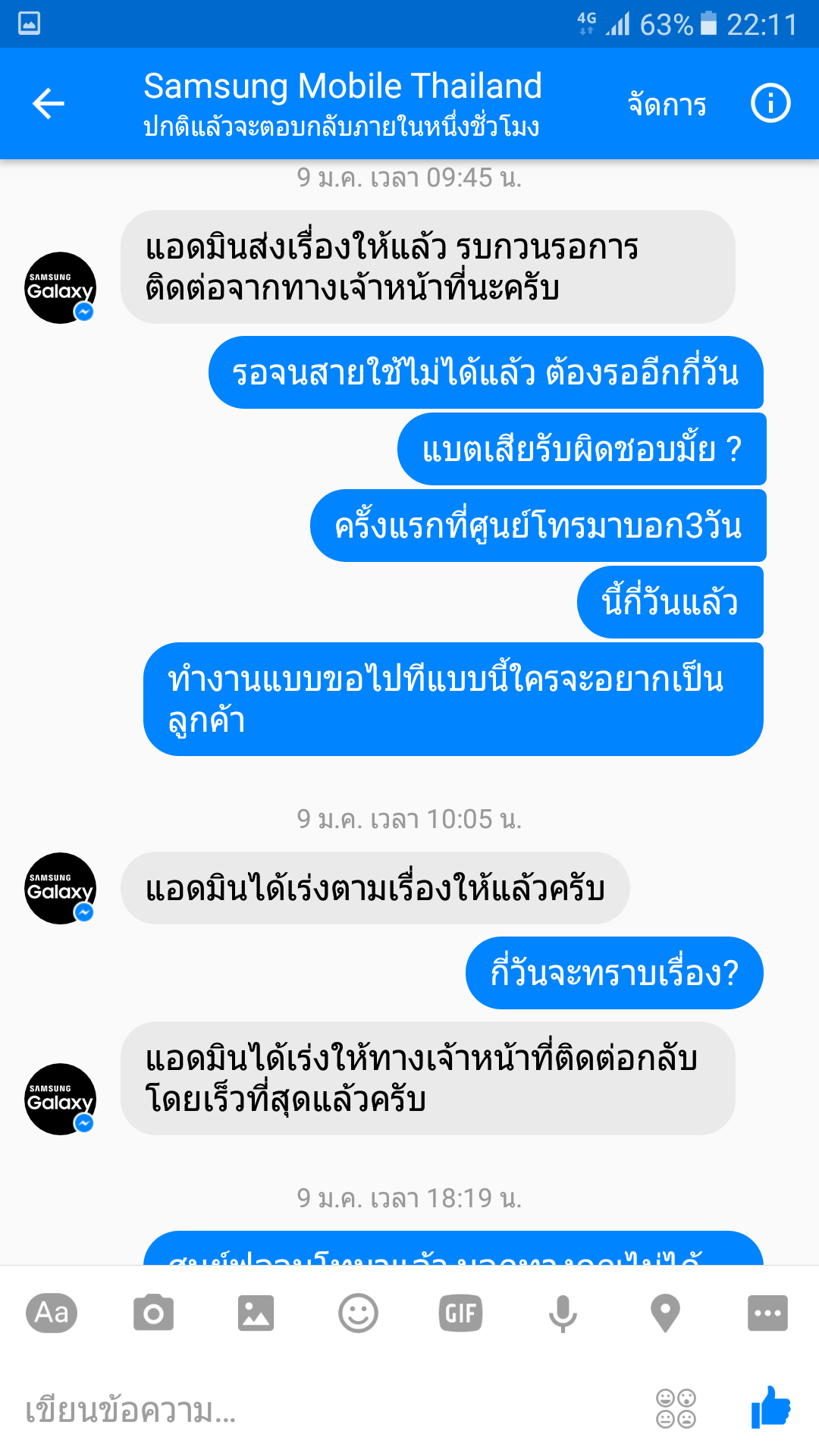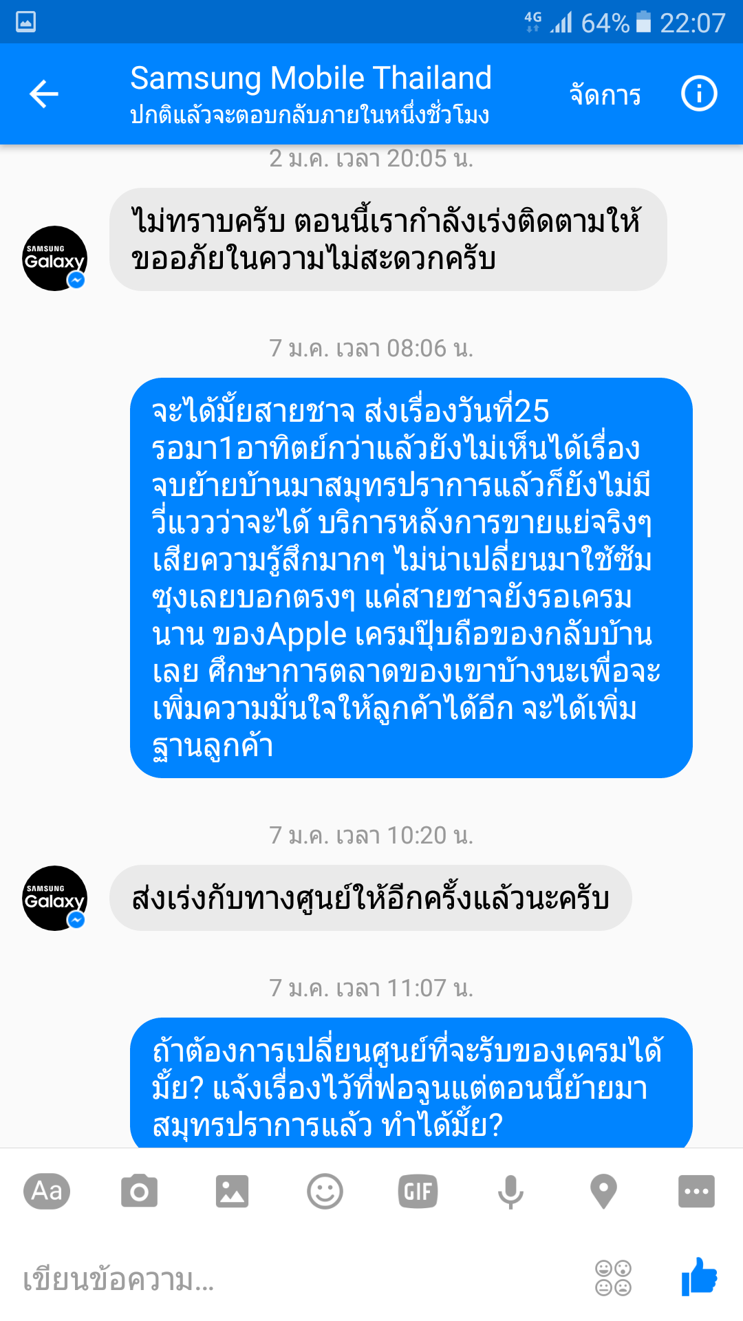 ผิดหวังมากจริงๆ พวกคุณมีงานเพราะพวกเราเป็นลูกค้าแต่ทำไมไม่ให้ความสำคัญกันเลยไม่คิดว่าเหตุการณ์แบบนี้จะเกิดขึ้นกับตัวเอง ถ้าย้อนเวลาได้จะไม่เป็นลูกค้าซัมซุง และอนาคตก็จะไม่ใช้แบรนด์นี้อีก แค่สายชาร์จก็เหนื่อยขนาดนี้ บริการหลังการขายแย่มาก มากแบบที่ไม่คิดว่าจะมากได้ขนาดนี้ คำว่าบริการไม่มีเลยต้องเสียตังโทรตามเรื่องเองถึงได้ของ ของอยู่ในประกันแท้ๆ ผู้บริโภคคิดก่อนซื้อนะครับ อ่านรีวิวเยอะๆแบรนด์ไหนดี ไม่ดี ตัดสินใจดีๆ มือถือสมัยนี้ราคาไม่ต่างกันมาก บริการหลังการขายสำคัญสุดคับ