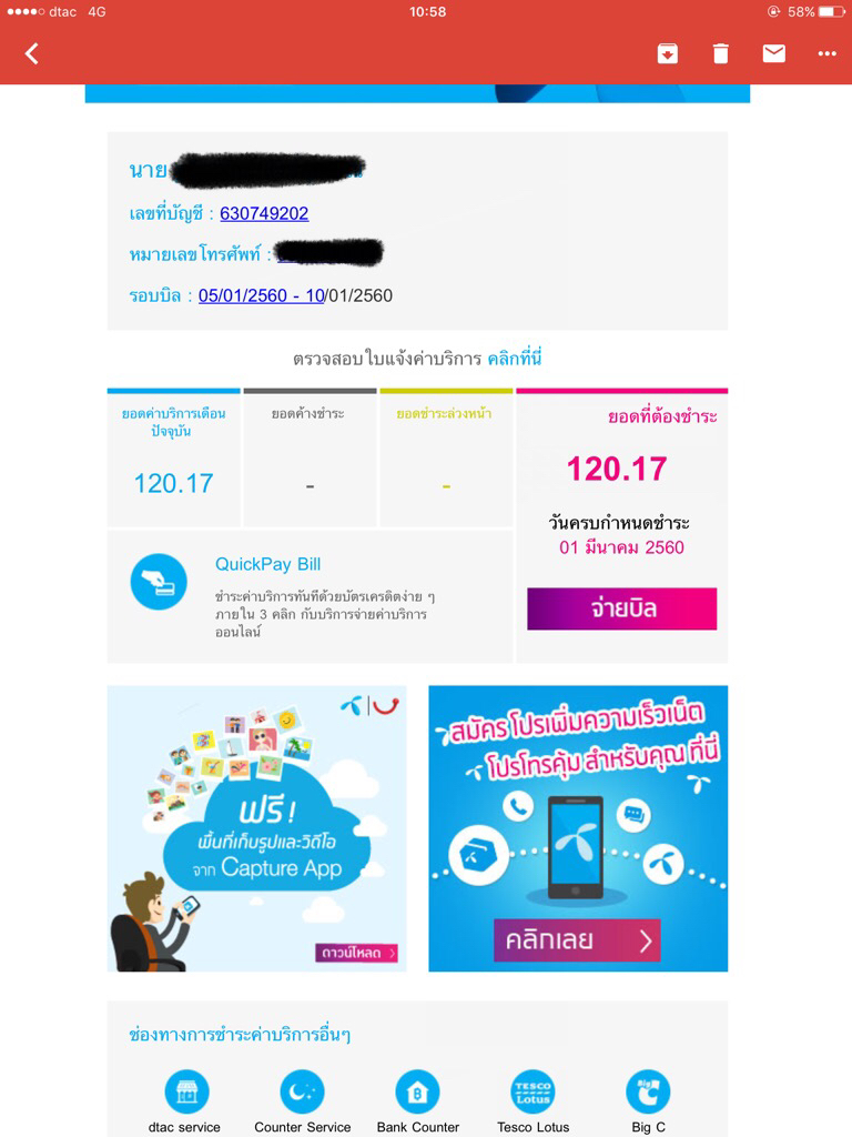 จากดีแทคแอพยอดตามภาพ ที่ต้องชำระ 520 กว่าบาท แต่ทำไมในอีเมลที่รับ e-invoice ถึงมียอดมาสองยอดครับ งง ขอรายละเอียด