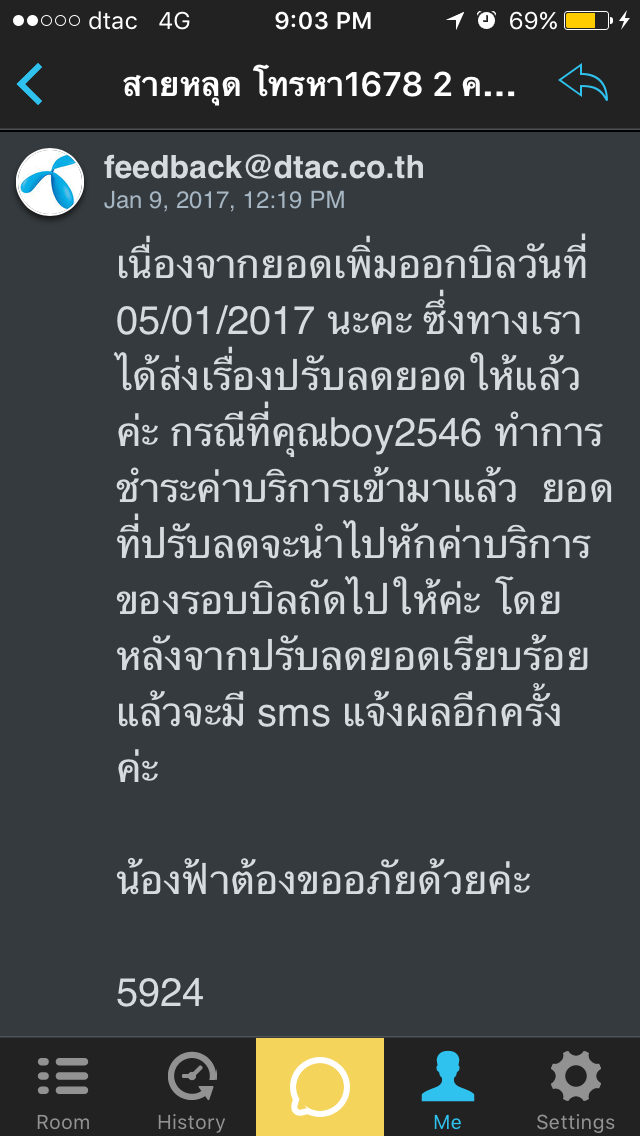 เดือน ธค 59 โทรเข้า 1678 สามครั้ง สายหลุด ไป 2 ครั้ง cc dtac บอกจะคืนเงินให้ รอบบิล มค 60 แต่พอรอบบิล ออกแล้ว และผมก็ชำระเงินแล้ววันนี้ นึกขึ้นได้เลยมาตรวจสอบใบแจ้งยอดค่าบริการ สรุปคือ dtac ไม่ยอมคืนเงินให้ แบบนี้โกหก เงินแค่ 6 บาท