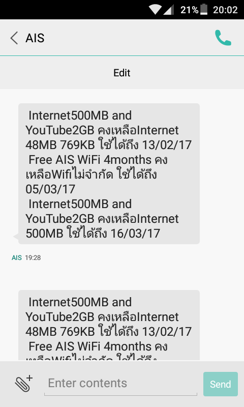 ประมาณเดือนธันวาคม 2559 ได้ทำการดาว์นโหลดหนังจาก Youtube เพื่อดู Offline เพราะไม่ชอบเปิดเน็ตตลอดเวลา หนังความยาวประมาณ 1GB ซึ่งปกติไม่มีปัญหาใดๆ แต่วันนั้นระหว่างดาว์นโหลดมี SMS แจ้งว่าเน็ตหมด เลยรีบหยุดการดาว์นโหลดและตรวจสอบ ก็พบว่าการดาว์นโหลดครั้งนั้นระบบของ AIS ไปทำการตัดปริมาณการใช้ข้อมูลจากเน็ตทั่วไป(500MB) ไม่ใช่ตัดจาก Youtube(2GB) เหมือนปกติ ทำให้เน็ตทั่วไปหมดและไปทำการหักเงินในหมายเลขไปด้วย ได้ทำการตรวจสอบเกือบ 30วัน แต่ไม่พบว่าเกิดจากอะไรจนขึ้นรอบใหม่ ครั้งนั้นทาง CC ก็พยายามประสานงานเพื่อหาคำตอบแต่คงไม่มีเครื่องมือ และเสนอเน็ต 500MB/30วัน ชดเชย แต่ทางผมปฏิเสธเพราะเน็ตรอบใหม่มาแล้ว เลยให้ส่ง SIM One2Call ฟรีมาให้ 1ใบ ถือว่าจบกันไป