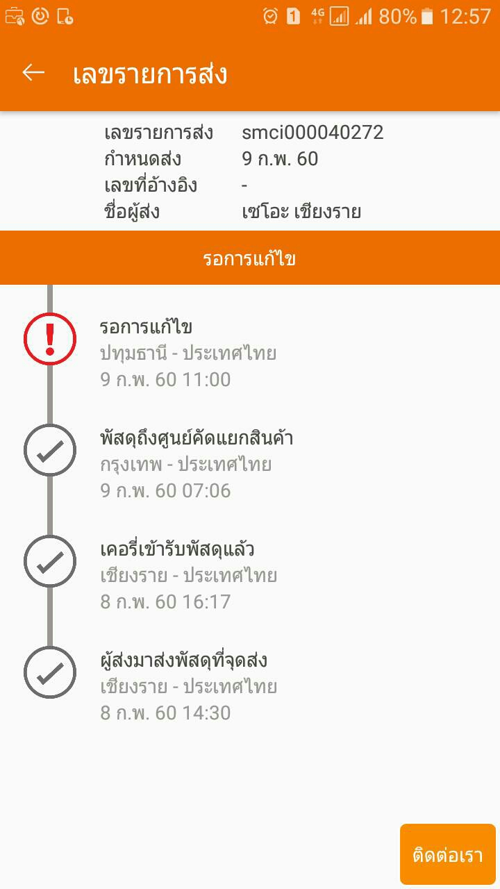 กระทั่งวันที่ 9 ช่วงเย็น ปลายทางยังไม่ได้รับสินค้า ได้ตรวจสอบหมายเลข และขึ้นสถานะว่ารอการแก้ไข แต่เป็นเวลาดึกมากแล้ว จึงไม่สามารถโทรสอบถามได้ ว้นที่ 10 กพ. 60 จึงได้สอบถามและเช็คสถานะอีกครั้ง ก็ยังคงสถานะเช่นเดิม