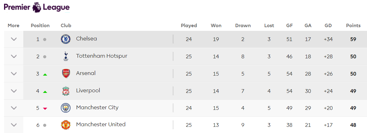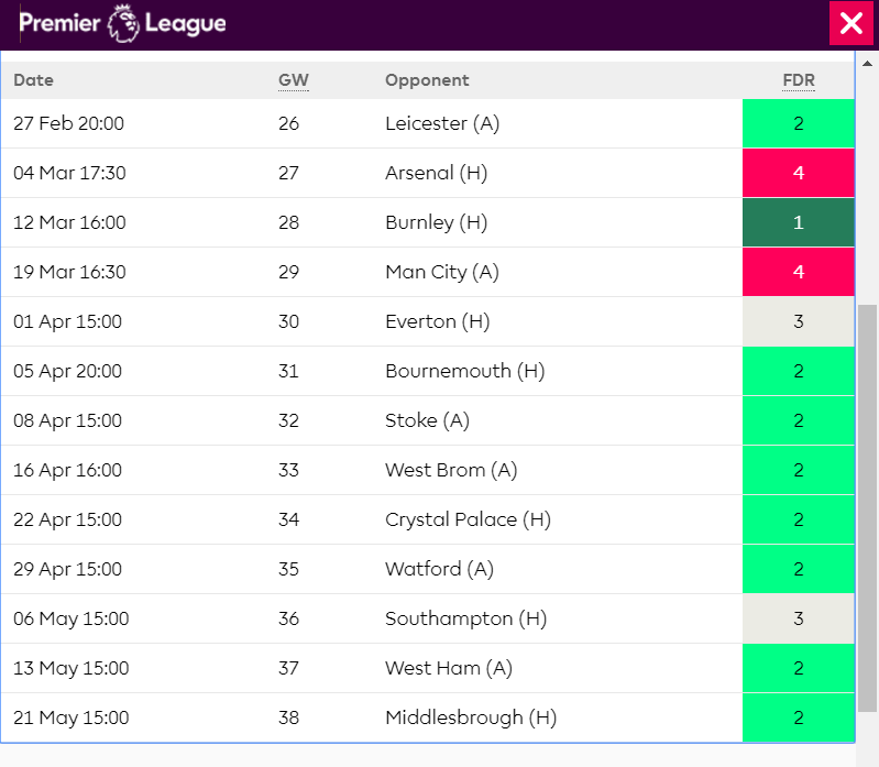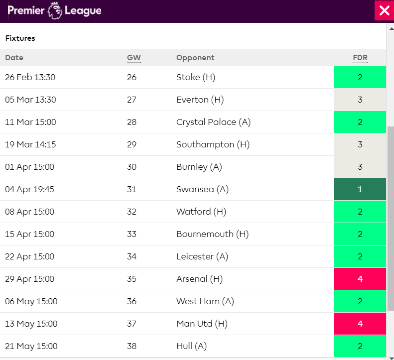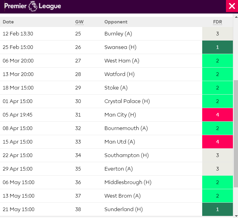 แต่อย่างไรก็ตามจะประมาท เอฟเวอร์ตัน (นัดที่ 27) เซาท์แธมตัน และเบิร์นลีย์ (นัดที่29-30) ไม่ได้เด็ดขาด เพราะถ้าได้พลาดได้พลั้งขึ้นมา อาจหลุดอันดับ 2 ได้ในเร็ววัน