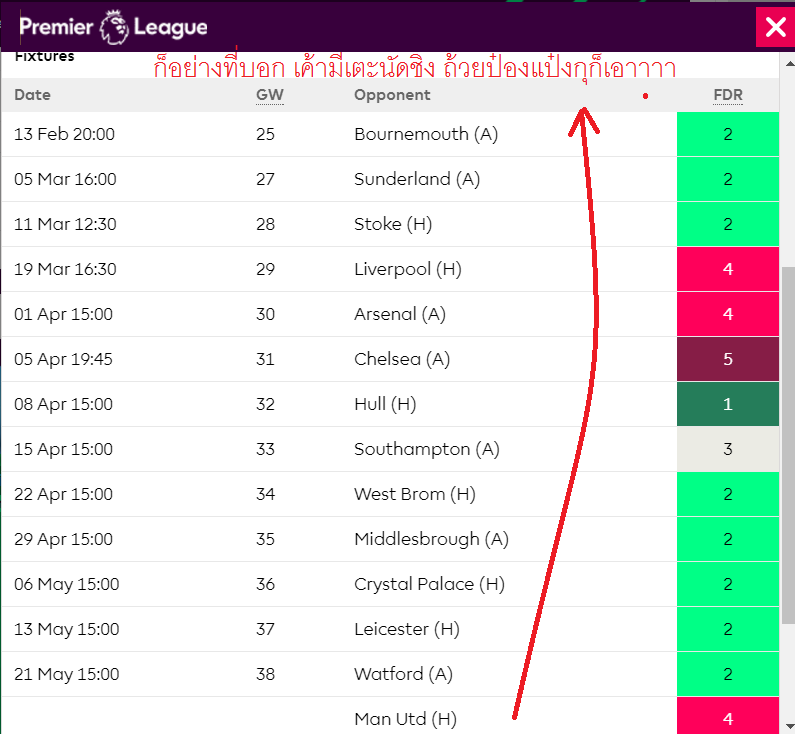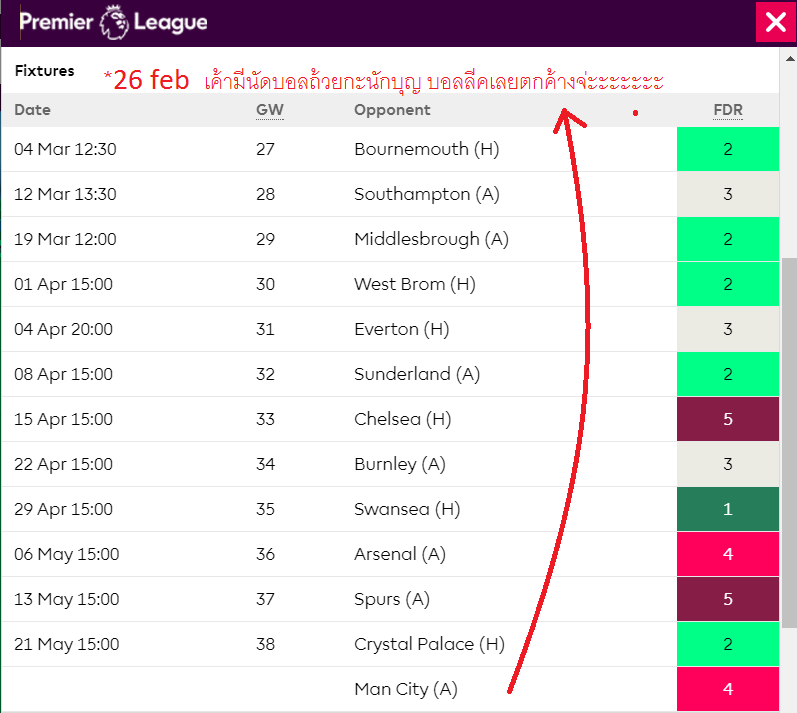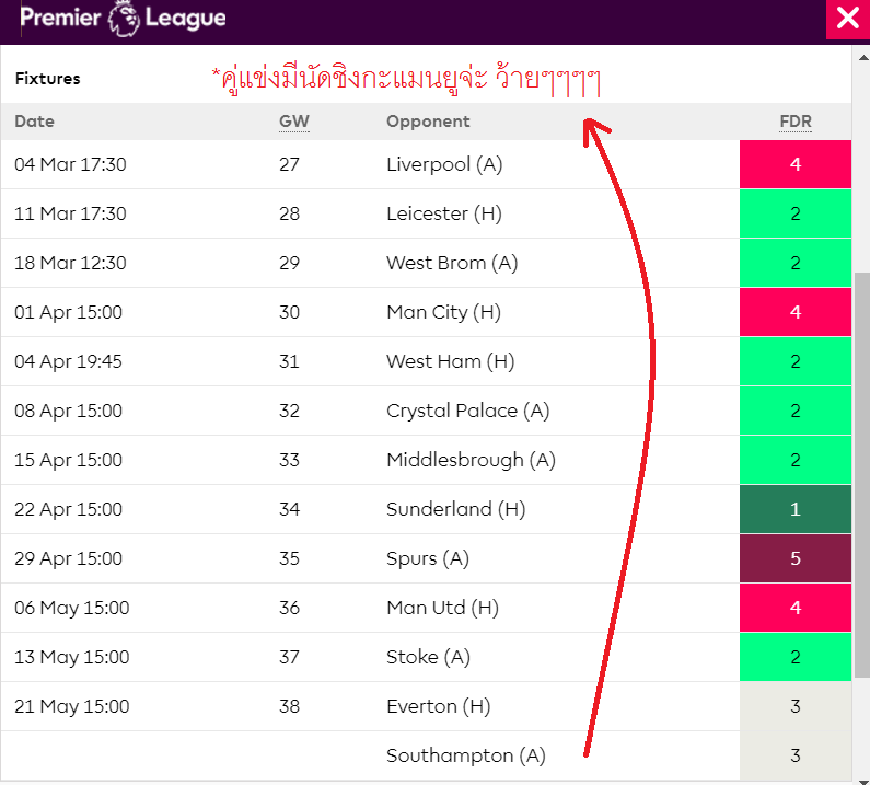 จะหนักก็คือนัดที่ 31 กับ 33 ที่ต้องเจอกับ แมนซิตี้ และ แมนยู ส่วนนัดที่ 32 ก็เจอบอร์นมัธ (จะว่าง่ายก็ง่าย ยากก็ยาก เพราะเกมเหย้าของบอร์นมัธไม่ใช่ธรรมดา)