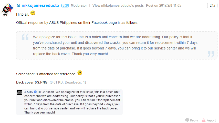 ดังการสนทนานี้ asus ฟิลิปปิน รับเปลี่ยนเครื่อง และถ้าเกิน 7 วันเปลี่ยน อะไหล่