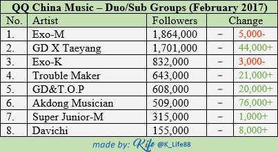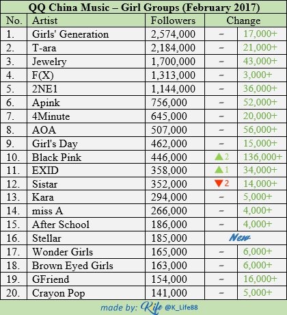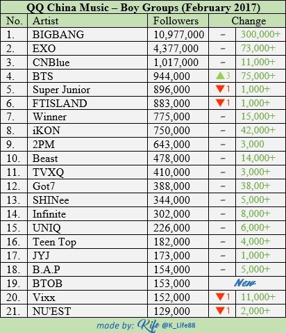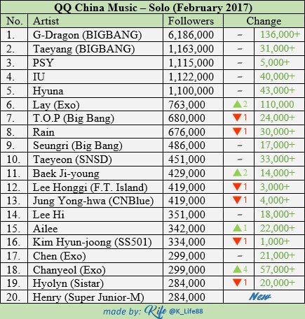 Korean artists who gained the most followers on the China's QQ Music in the past month 1 BLACKPINK (+159,000) 2 iKON (+67,000) 3 Seungri (+52,000) 4 Lay (+49,000) 5 IU (+43,000) 6 Wanna One (+39,