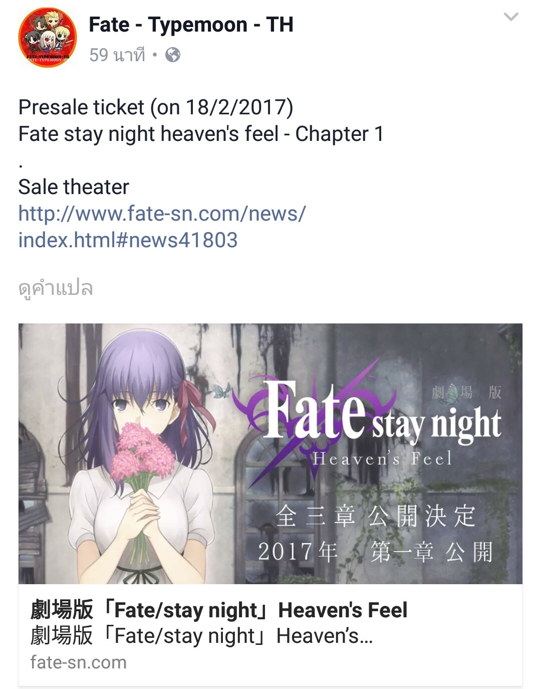 วันที่ 18 กุมภาพันธ์นี้ จะมีประกาศสำคัญเกี่ยวกับอนิเมะโรงเรื่อง Fate/stay night [Heaven's Feel] Chapter 1