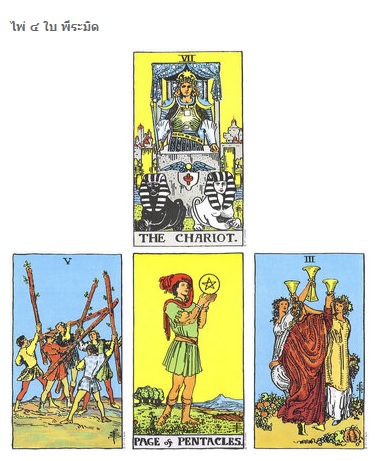 ผมตั้งคำถามว่า : ผมจะได้ไปทานข้าวเย็นกับน้องที่คุยด้วยหรือไม่ จับไพ่ 4 ใบ ดังนี้ รบกวนด้วยครับ