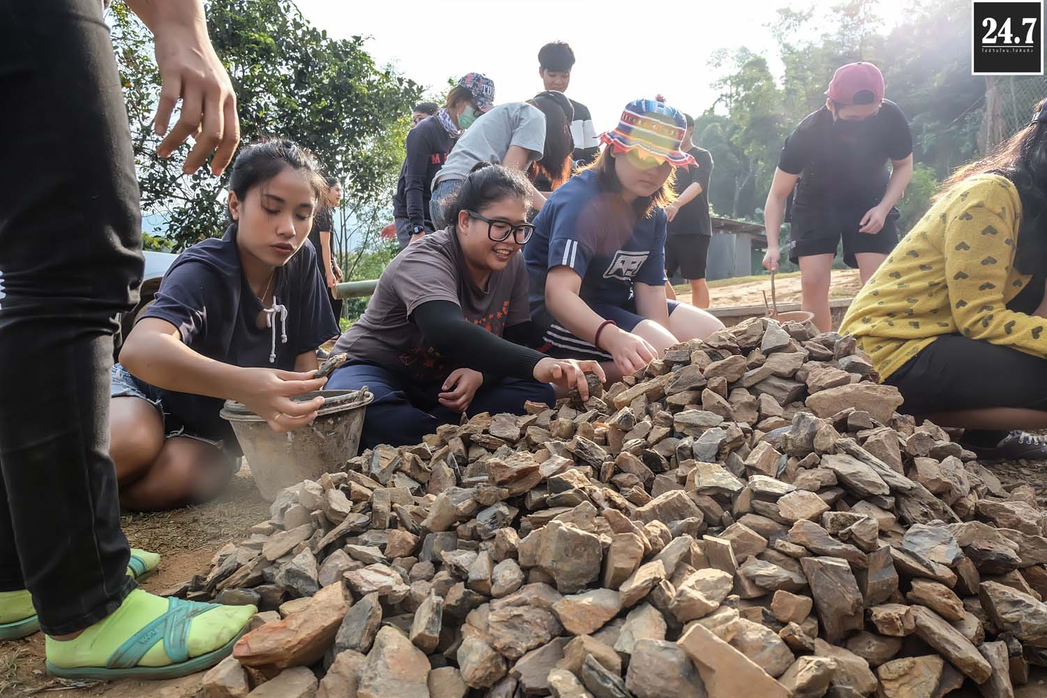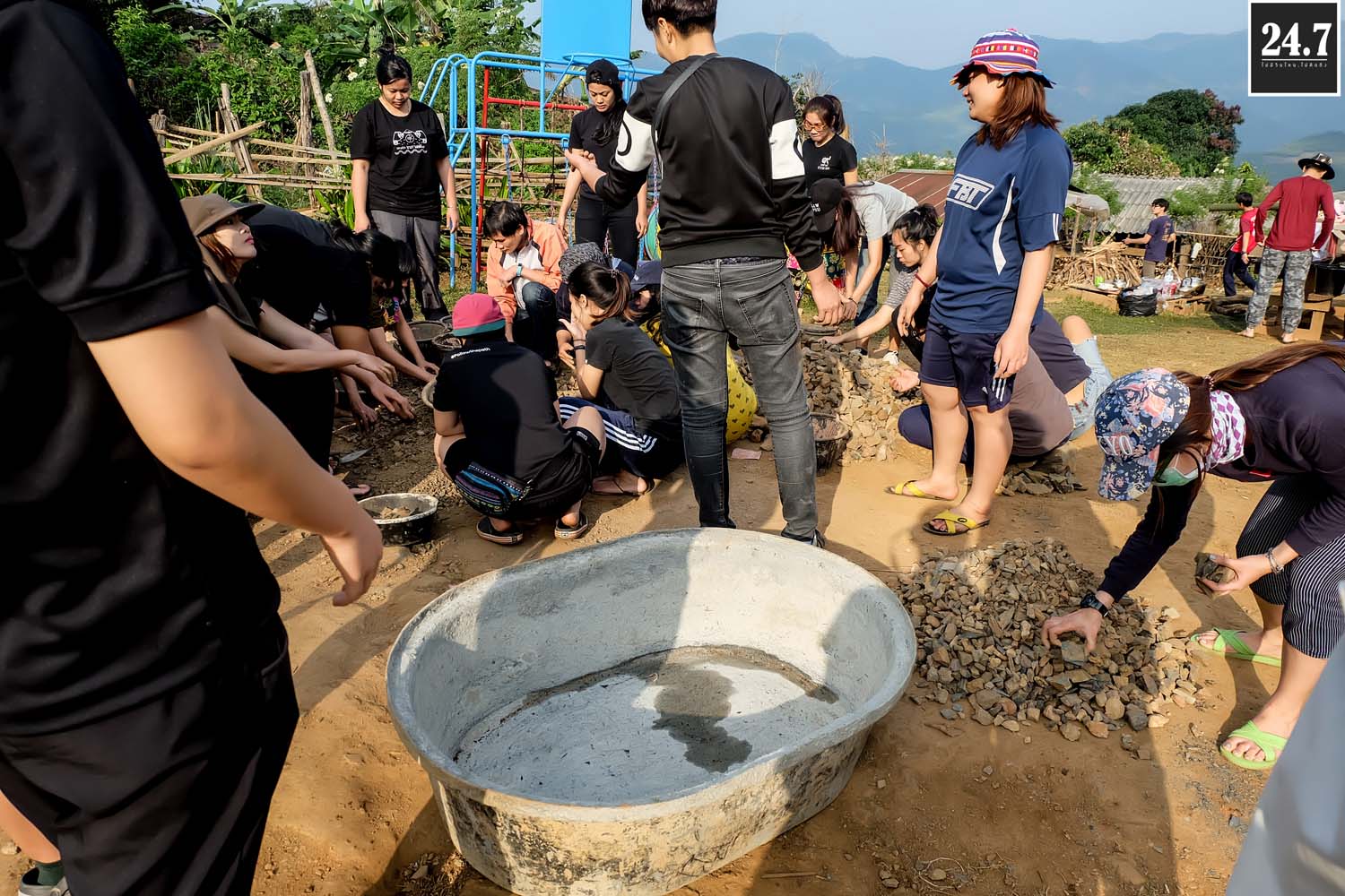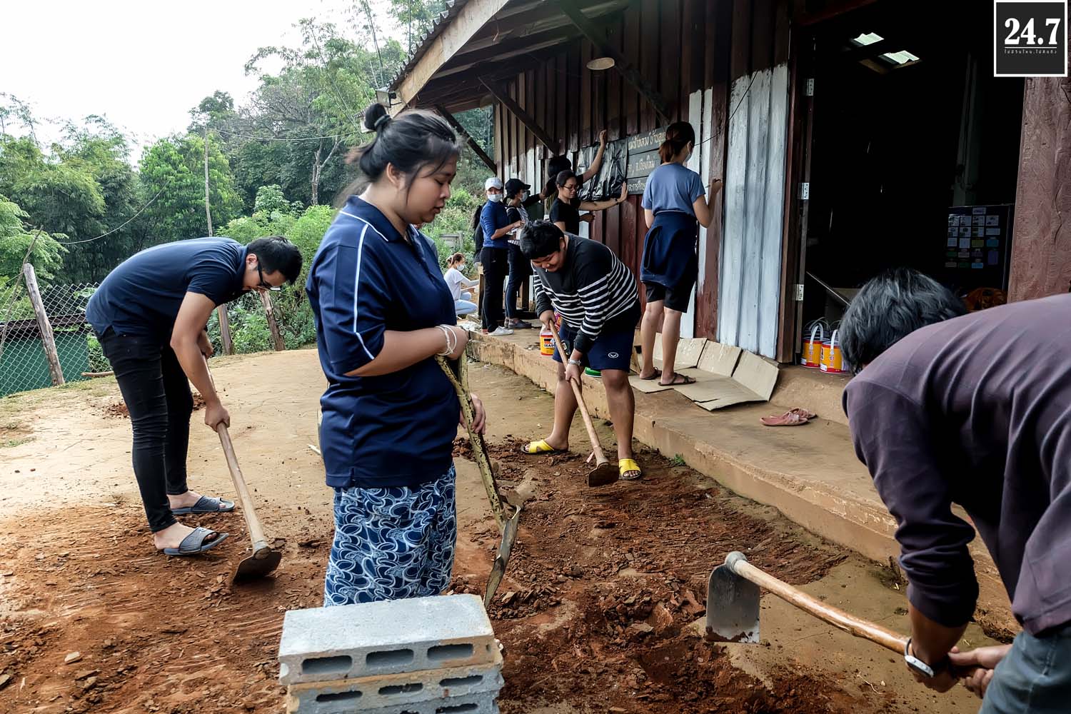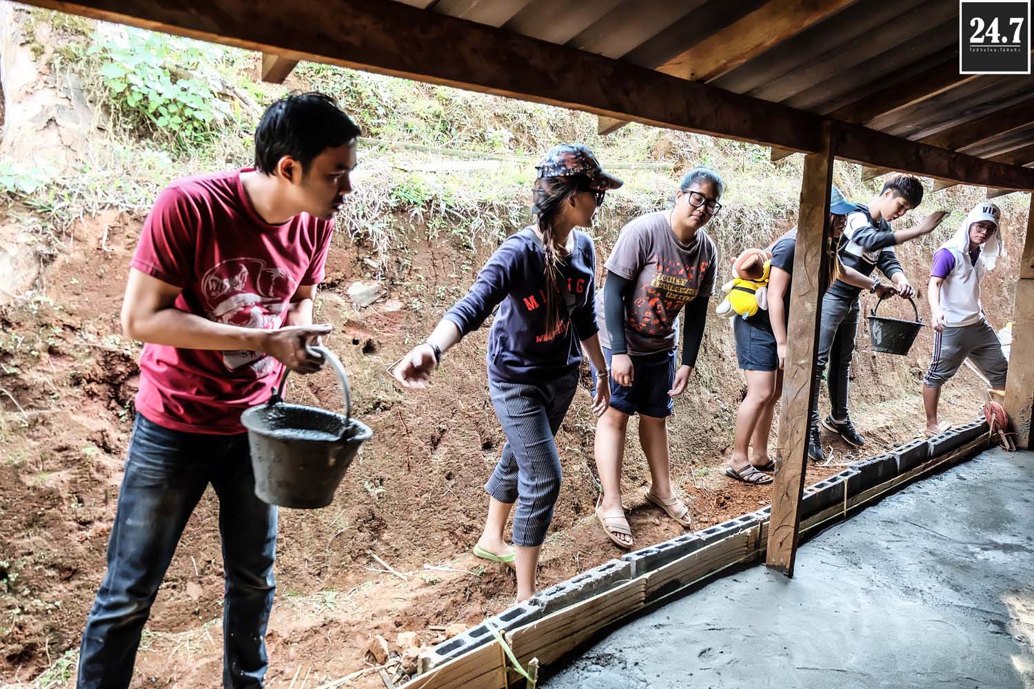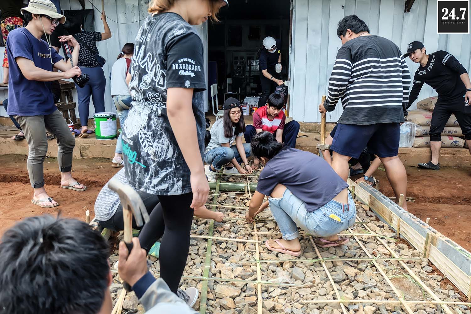 หลังจากนั้นก็แยกตามหน้าที่รับผิดชอบของตัวเอง เทปูน ผสมปูน คัดแยกก้อนหิน ที่บอกว่าคัดแยกเพราะว่าเรานำหินก้อนใหญ่ที่ภูเขามาใช้เป็นส่วนผสมในการเทรองพื้น ต้องมีการทุบก้อนหินให้เล็กลงบ้าง TT ผ่าไม้ไผ่เพื่อใช้สำหรับสานแทนเหล็ก เราใช้ไม้ไผ่แทนเหล็ก โดยมีชาวบ้านมาช่วยอีกแรง บางส่วนก็สอนหนังสือแยกเป็นฐาน รวมไปถึงกิจกรรมสันทนาการเด็กๆ