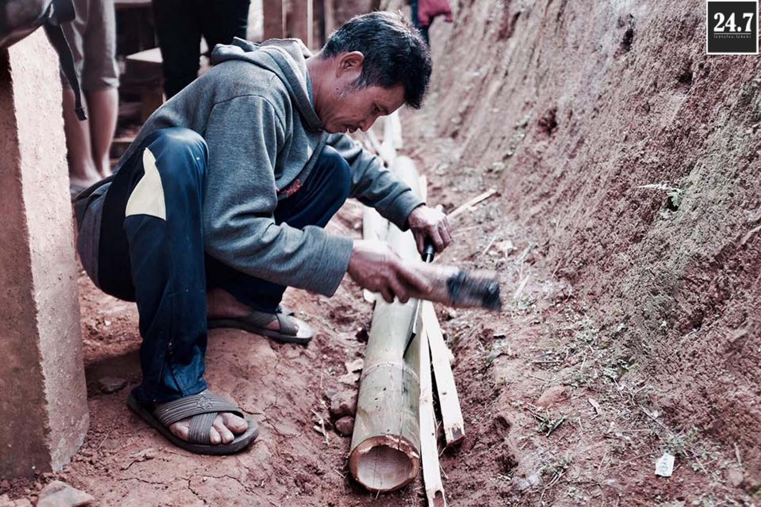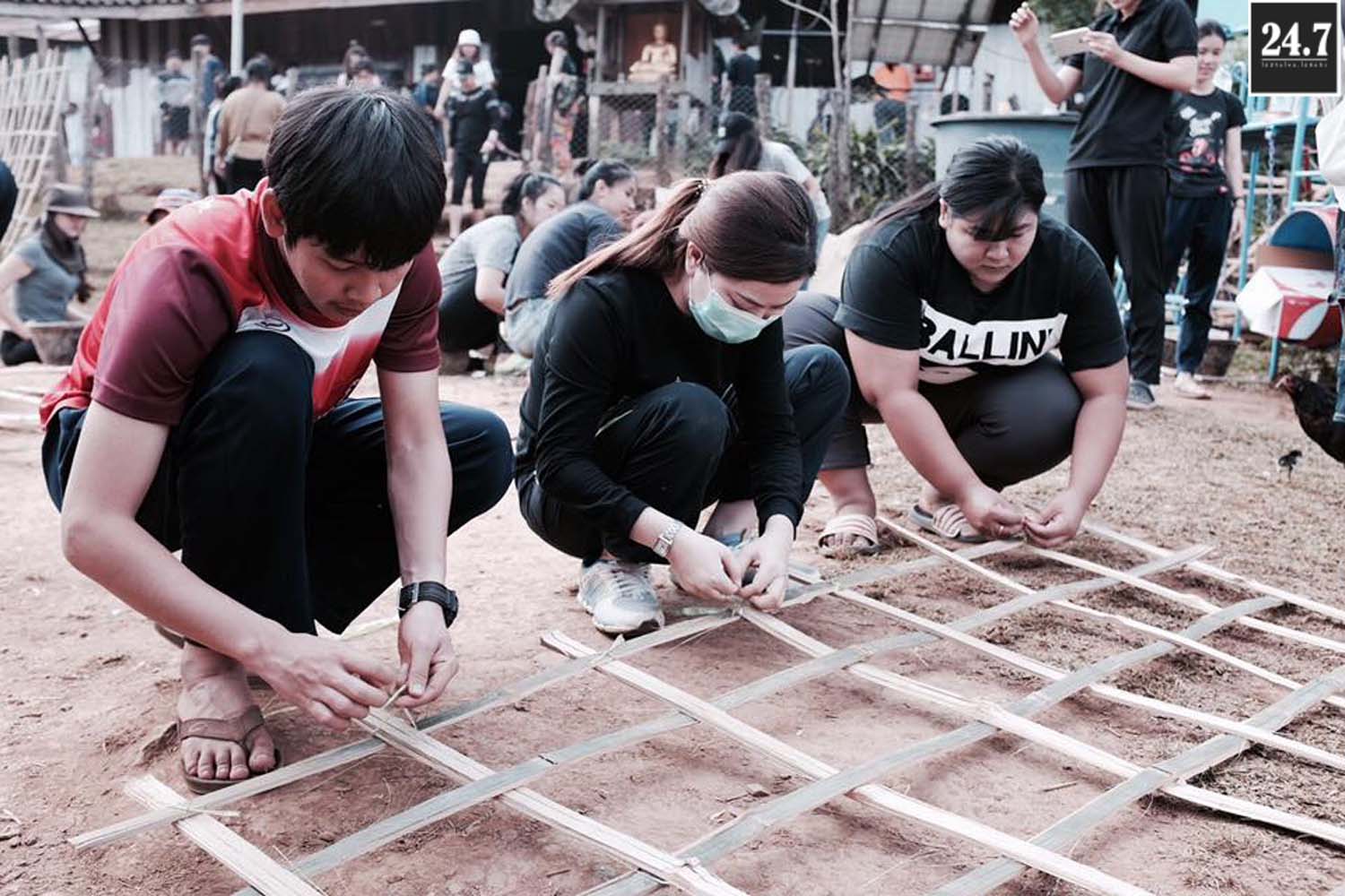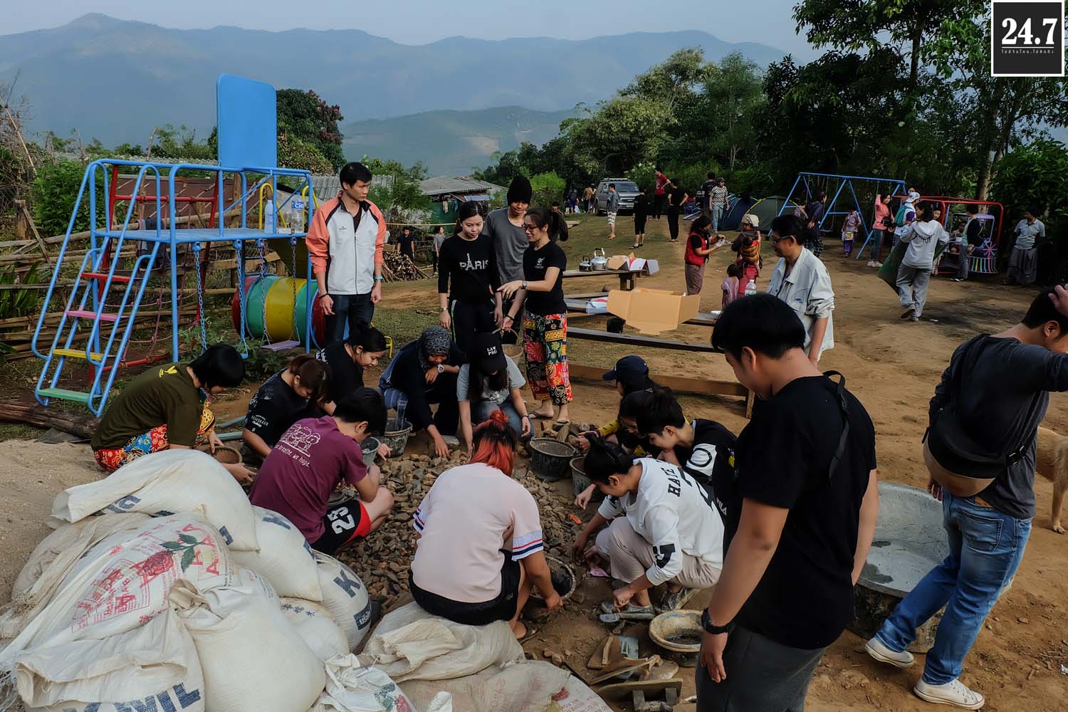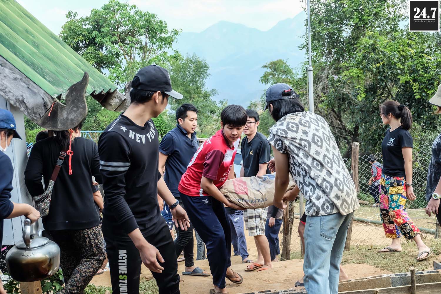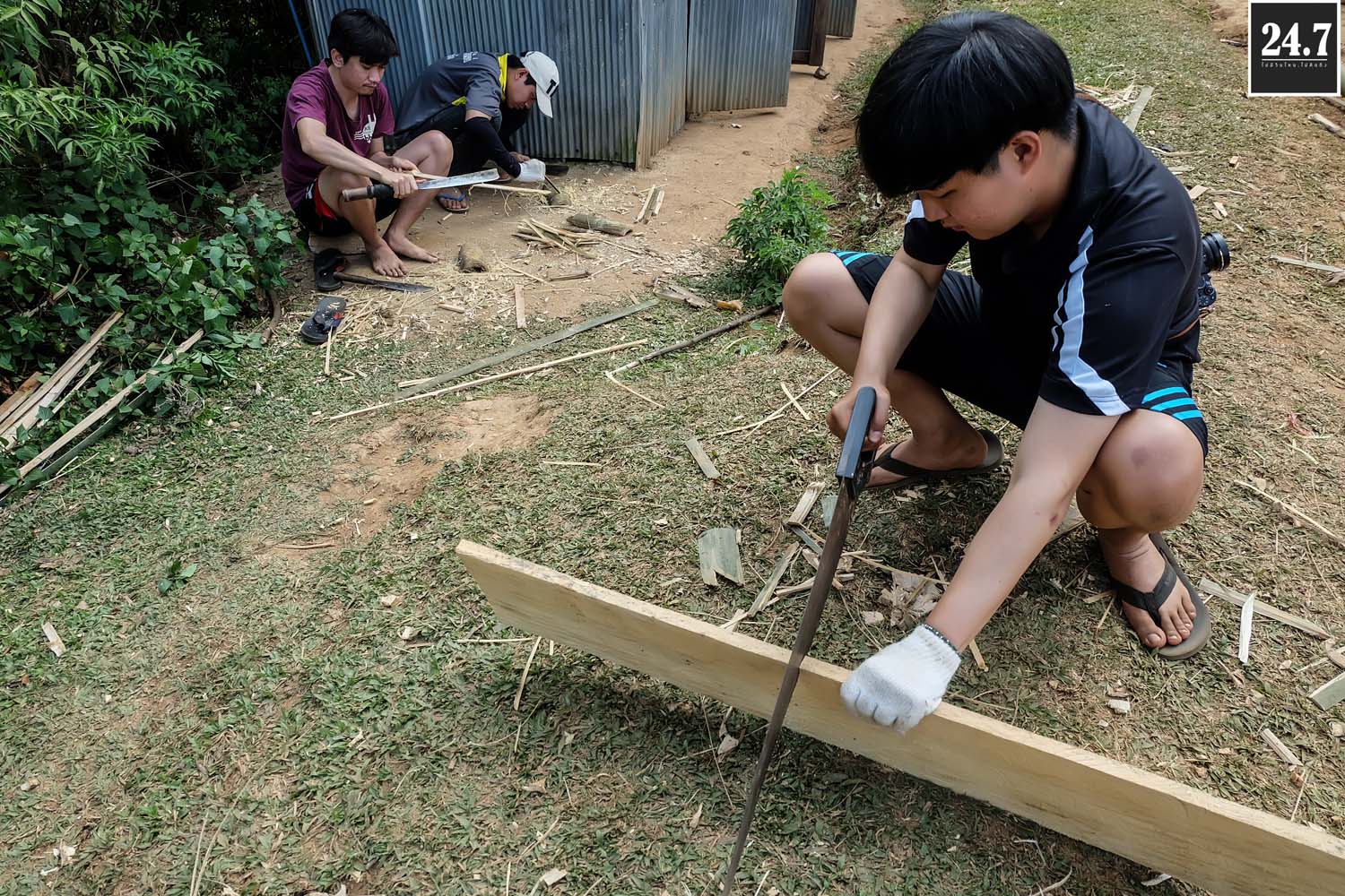 หลังจากนั้นก็แยกตามหน้าที่รับผิดชอบของตัวเอง เทปูน ผสมปูน คัดแยกก้อนหิน ที่บอกว่าคัดแยกเพราะว่าเรานำหินก้อนใหญ่ที่ภูเขามาใช้เป็นส่วนผสมในการเทรองพื้น ต้องมีการทุบก้อนหินให้เล็กลงบ้าง TT ผ่าไม้ไผ่เพื่อใช้สำหรับสานแทนเหล็ก เราใช้ไม้ไผ่แทนเหล็ก โดยมีชาวบ้านมาช่วยอีกแรง บางส่วนก็สอนหนังสือแยกเป็นฐาน รวมไปถึงกิจกรรมสันทนาการเด็กๆ