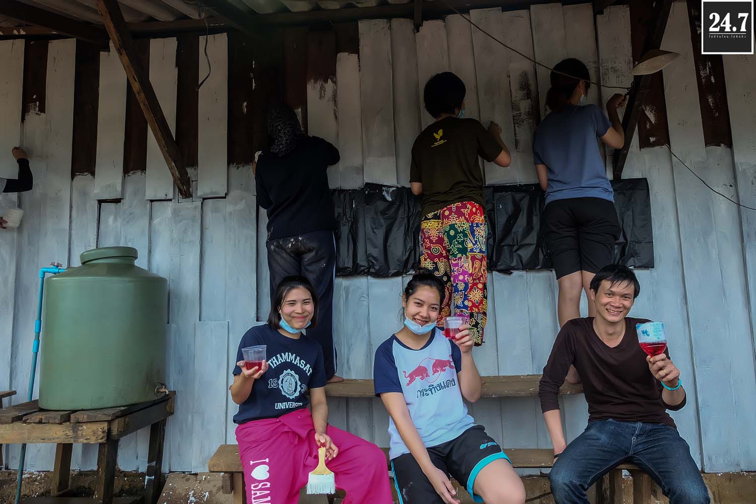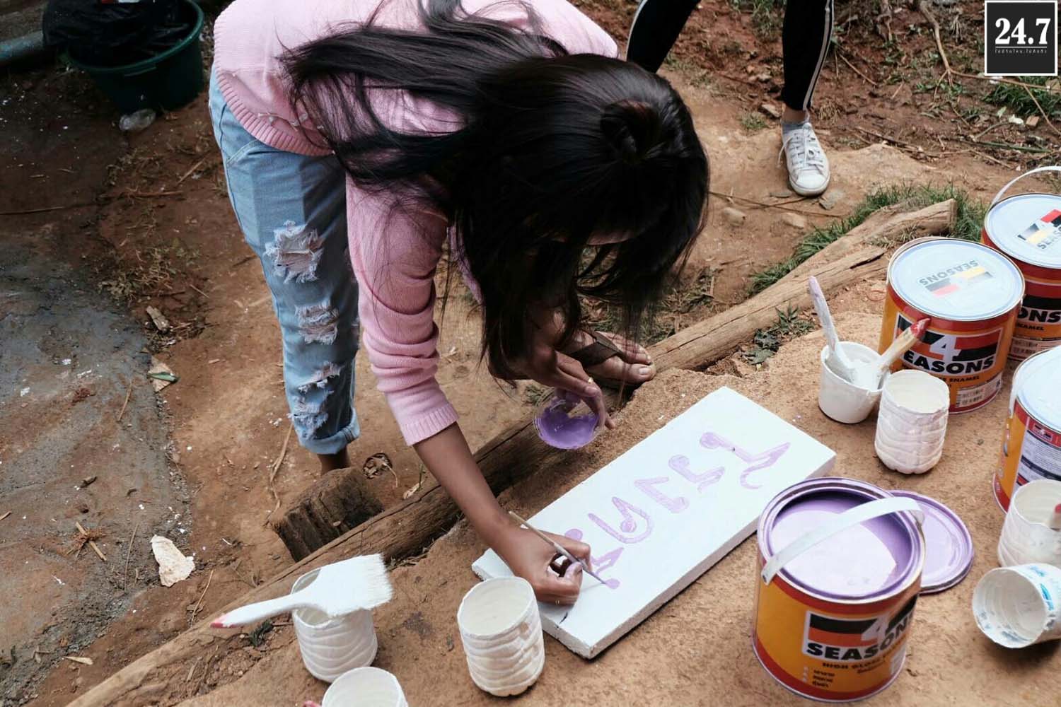 งานทาสี : แจกแปรงทาสีให้เพื่อนๆคนละอัน ยืนเรียงหน้ากระดาน ทากันสนุกสนาน โดยสีที่เราใช้ทาจะเป็นสีม่วง ซึ่งครั้งแรกเราก็งงๆทำไมครูน้ำถึงให้เอาสีม่วง มารู้เหตุผลทีหลังคือ เพราะว่าเป็นสีประจำของสมเด็จพระเทพ