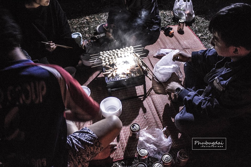 พอถึงทางราบแล้วเดินไปสักพักก็ถึงจุดกางเต้น ฮ่าๆขนแขนผมนี่ลุกสู้เลยไม่ใช่ปวดขี้นะครับ แต่มันหนาวมากกกกกกกกกกก เอ้ารีบครับรีบๆ กางตงกางเต้น แยกย้ายกันจัดเก็บของ ส่วนพี่ตุ้มก็ไปหาฟืนมา มาจัดแจงสถานที่กินข้าว ผมก็จัดแจงเหมือนกัน จัดแจงเบียร์ในกระเป๋าออกมาเรียงให้สวยงามน่ารับประทาน ฮ่าๆ บนนั้นเบียร์จะเย็นเองโดยอัตโนมัติ หายห่วงครับ