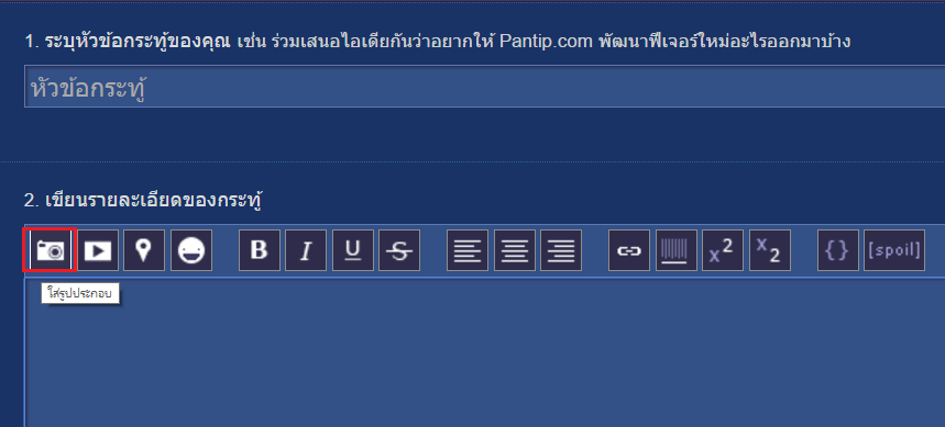 สำหรับการใส่รูปภาพประกอบในการตั้งกระทู้นั้นต้องเลือกจากไอคอนกล้องตามรูปภาพตัวอย่างนี้นะคะ