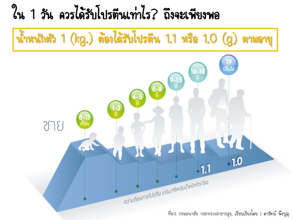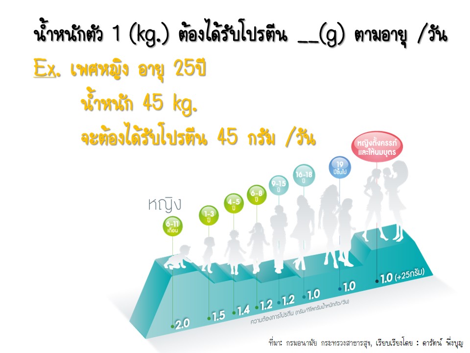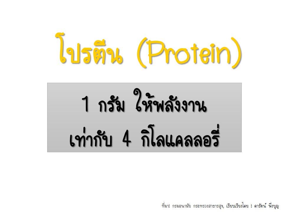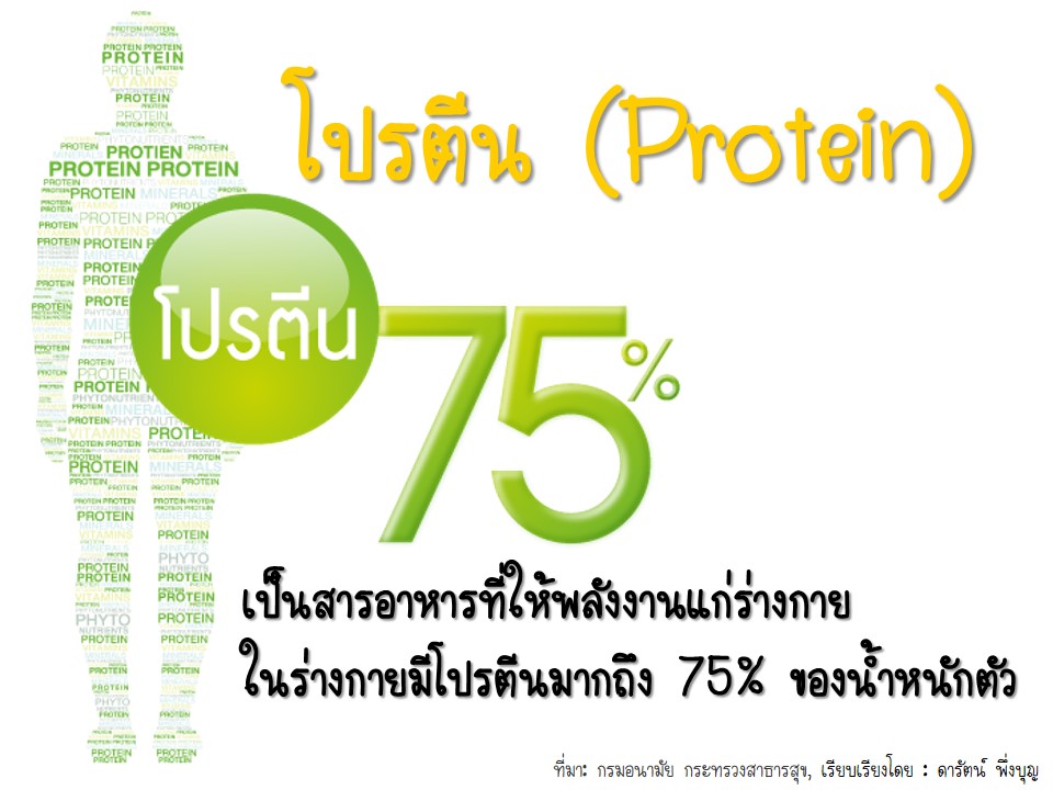 โปรตีน แปลว่า สิ่งสำคัญอันดับแรก ในร่างกายมีโปรตีนมากถึง 75% ของน้ำหนักตัว (Harvard School of Public Health 2011) เป็นสารอาหารที่ให้พลังงานแก่ร่างกาย โดยโปรตีน 1 กรัม ให้พลังงานเท่ากับคาร์โบไฮเดรต 1 กรัม คือ 4 กิโลแคลลอรี่ ที่สำคัญ โปรตีนเป็นสารอหารที่ร่างกายขาดไม่ได้ มีความจำเป็นต่อการเจริญเติบโตและการซ่อมแซมส่วนที่สึกหรอต่าง ๆ ของร่างกาย