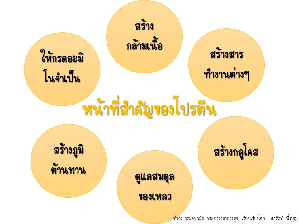 • เซลล์อื่นๆ เพราะทุกส่วนในร่างกายประกอบไปด้วยเซลล์ โปรตีนจึงสัมพันธ์กับสุขภาพของเราโดยตรง จำเนต่อเมแทบอลิซึมที่เป็นปกติ และมีส่วนสำคัญต่อกระบวนการสร้างภูมิคุ้มกันให้เซลล์ต่างๆ ทั่วร่างกาย