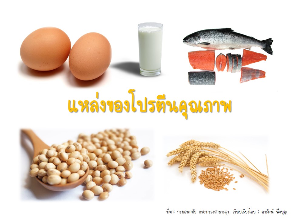 - ไข่ นม จัดเป็นแหล่งโปรตีนคุณภาพสูง เพราะให้กรดอะมิโนจำเป็นครบถ้วนและย่อยง่าย ปลาเป็นอันดับรองลงมา เนื้อสัตว์ต่างๆ ให้โปรตีนคุณภาพสูง ข้อเสียคือย่อยยากกว่า และมีไขมันและโคเลสเตอรอล