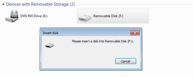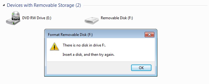 ที่ทำงานเจอปัญหาแบบนี้บ่อยมาก นำเอา flashdrive มาเสียบ ใน my computer จะโชว์เป็น removable disk ตัวจางๆ (ปกติจะต้องเป็นชื่อ drive ของเรา) เมื่อดับเบิ้ลคลิก ก็จะขึ้นดังรูป และเมื่อจะ format ก็ไม่สามา