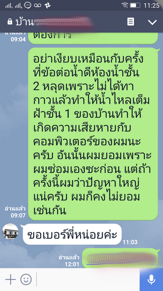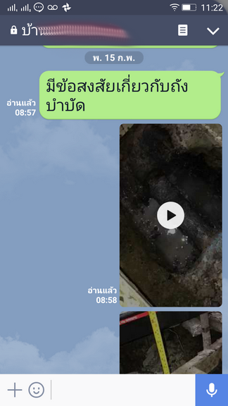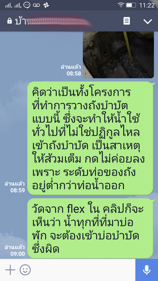 ณ หมู่บ้านแห่งหนึ่ง มีเหตุเกี่ยวกับถังบำบัด ทรุด หรือต่อท่อ flex ต่ำกว่าระดับ ทำให้น้ำของทุกที่ไหลย้อนเข้าถังทั้งหมด จึงเป็นสาเหตุทำให้กดชักโครกไม่ค่อยลง (เพื่อนบ้านผมเจอปัญหาแล้ว แต่บ้านผมจะมีปัญหาแค่ตอนหน้าฝน) ผมจึงเกิดข้อสงสัยเลย Line ไปถามโครงการ ตามภาพประกอบ
