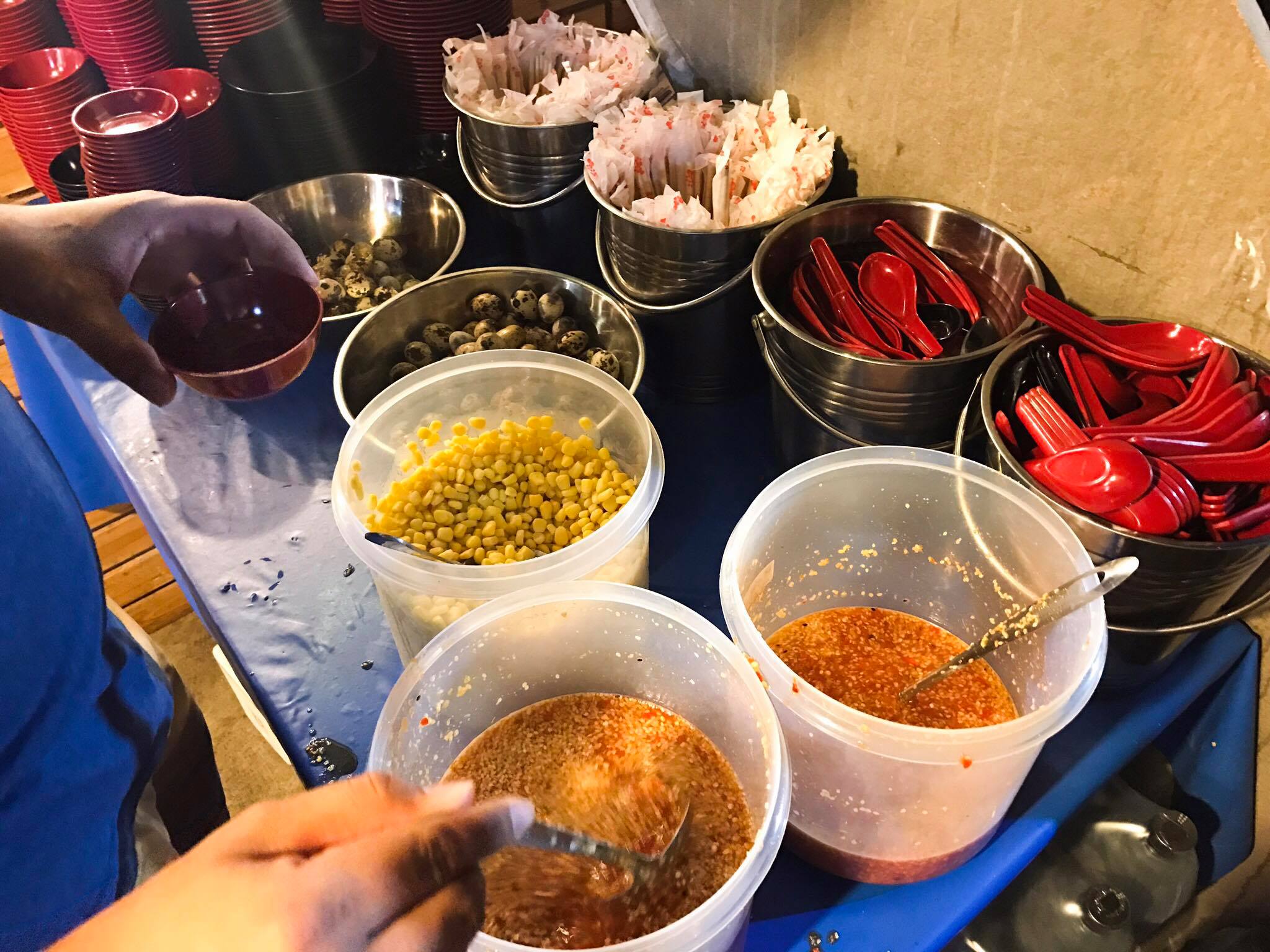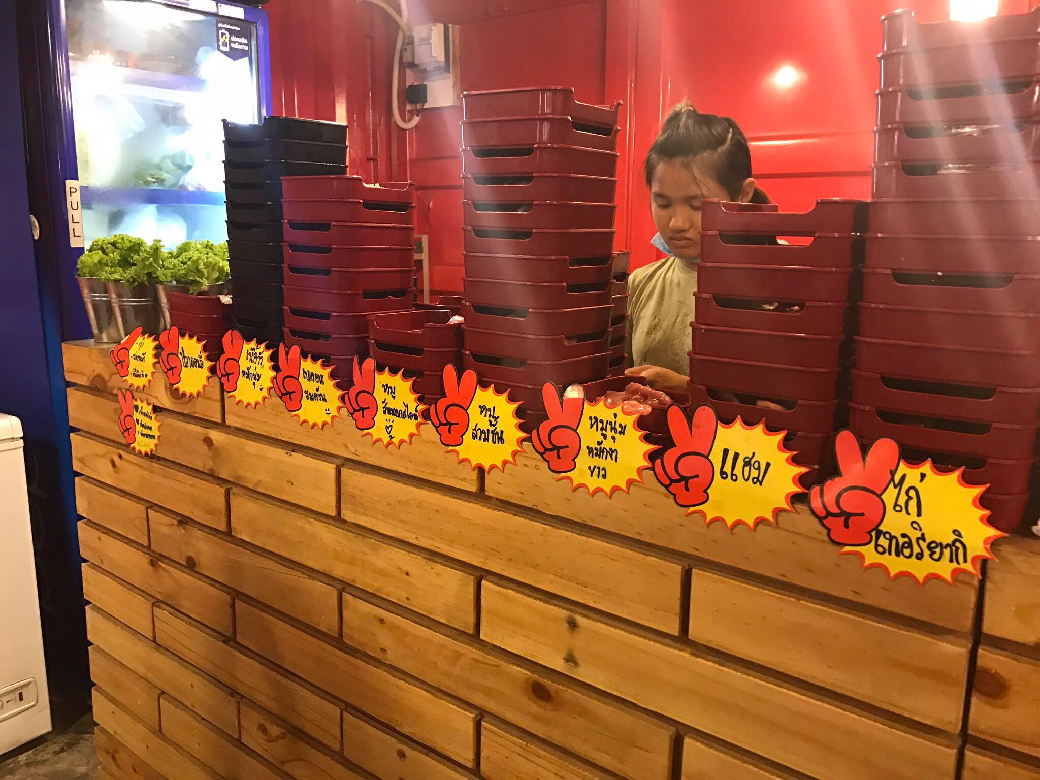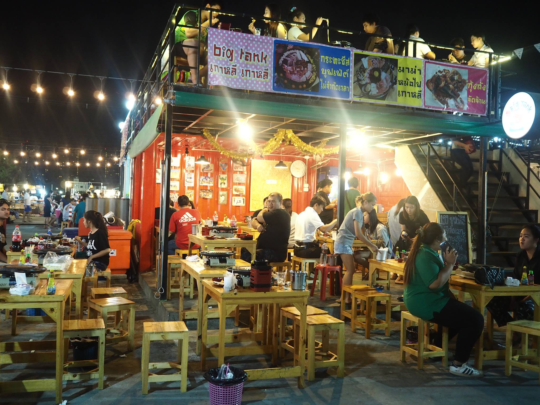 ร้านจะอยู่โซนตู้คอนเทรนเนอร์ฝั่งในเกือบๆสุดอีกฝั่งของตลาดค่ะ อยู่ข้างๆร้านจุดตรวจหอย ร้านอาหารโซนตู้คอนเทรนเนอร์จะมี 2 ชั้นค่ะ คนส่วนใหญ่จะยอมรอคิวเพื่อให้ได้นั่งกินข้างบน ซึ่งคราวก่อนเราได้นั่งกินข้างบนแล้วรู้สึกว่านั่งข้างล่างสบายกว่า 555+ เวลาจะลุกไปหยิบของกิน เติมน้ำจิ้มต้องเดินขึ้นลงบันได อยู่ข้างล่างจะเดินไปหยิบกี่ครั้งก็ได้