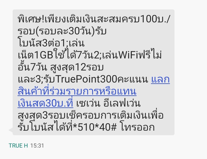 ผมก็ทำการเติมเงินปกติ ตามโปรที่ทรูส่งมาให้ แล้วก็ได้เน็ต 1G ค่าโทร 1000 บาท มาใช้ได้ แต่ตรงทรูพ้อย 300 พ้อยนี้คือยังไงครับ ผ่านมา 1 เดือนกว่าแล้วยังไม่มีวี่แววว่าจะให้เลย คือรอมานานมากแล้วอะ ตกลงจะได้หรือไม่ได้ นี้แค่รอบบินแรกนะครับ ยังไม่เติมรอบบิลที่ 2 เลยเพราะว่าทรูให้สูงสุด 3 รอบบิล