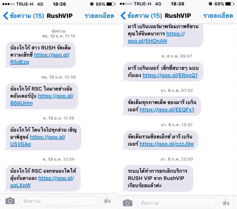 8.ผมตรวจสอบที่ข้อความของ RushVIP ตั้งแต่ข้อความแรก(เพราะไม่เคยลบสักข้อความ) พบว่าข้อความแจ้งกลับลูกค้าว่าสมัครไม่มีแต่อย่างใด มีข้อความส่งมาให้เริ่มตั้งแต่วันที่ 12 มกราคม - 5 กุมพาพันธ์ วันล่ะ 2ข้อความ รวมทั้งสิ้น 50ข้อความ แจ้งยกเลิกในวันที่5