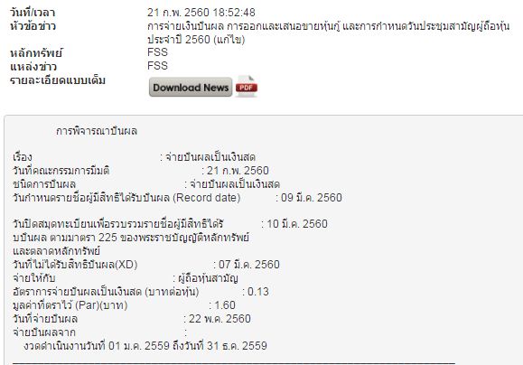 FSS นำมาแล้ว ลูกกำไรปี 2559 สุดยอด ตามด้วยปันผล 0.13 บาท/หุ้น โอ้ว...ออกงบสวนราคาวันนี้เลย