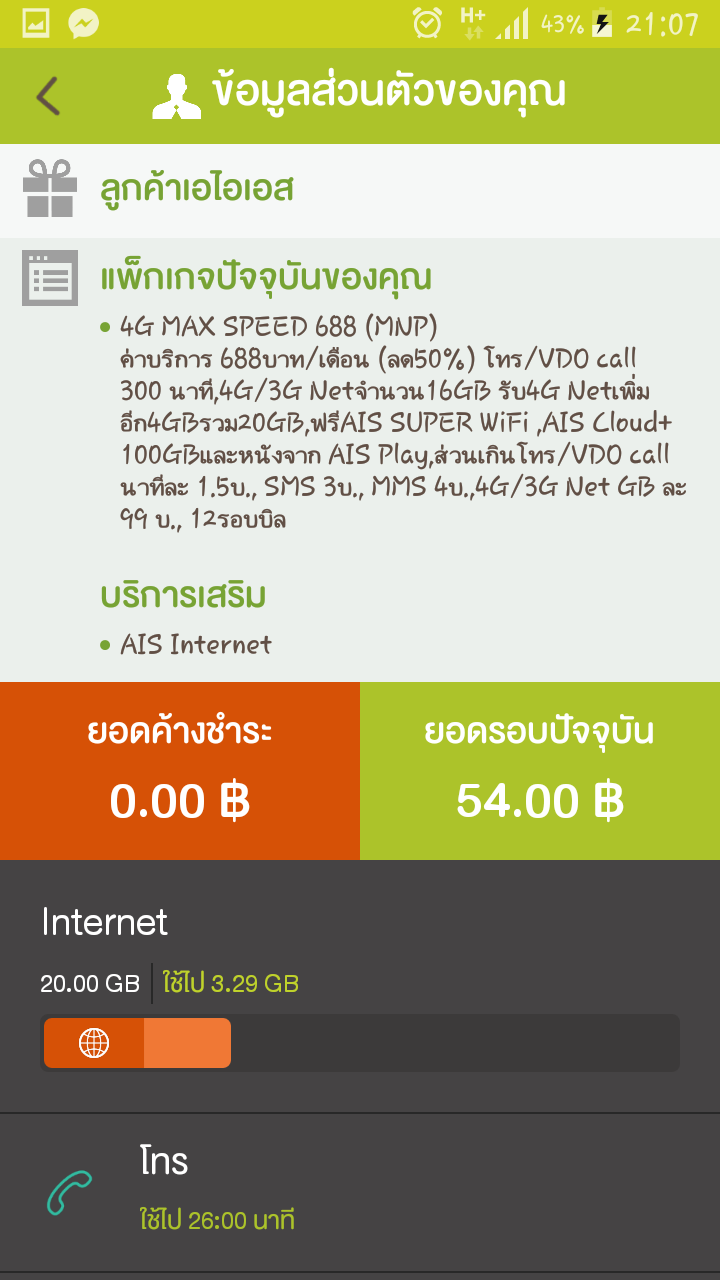 ทำเรื่องย้ายค่ายจาก True มา AIS แล้วสมัครแพ็คเกจลด 50% นาน 12 เดือน ได้เน็ตรวม 20 GB/เดือน พึ่งเปิดใช้งานวันนี้วันแรก หลังจากนั้น 10 นาที เลยเข้าไปลองเช็คข้อมูล