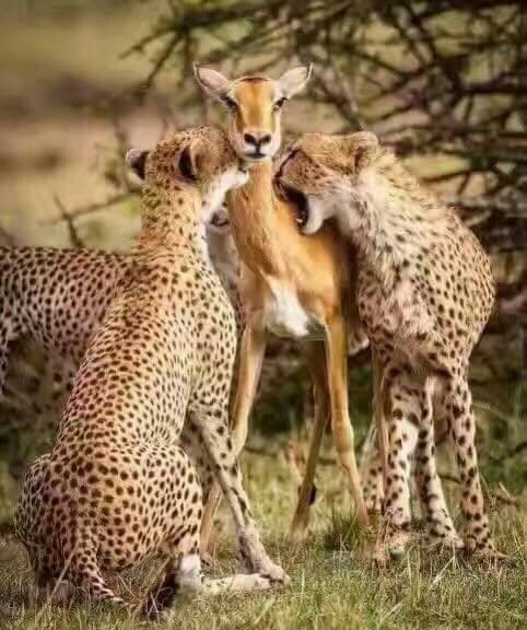 兩隻獵豹追一隻母鹿和兩個鹿寶寶