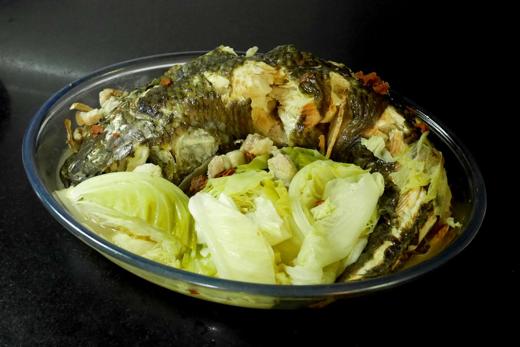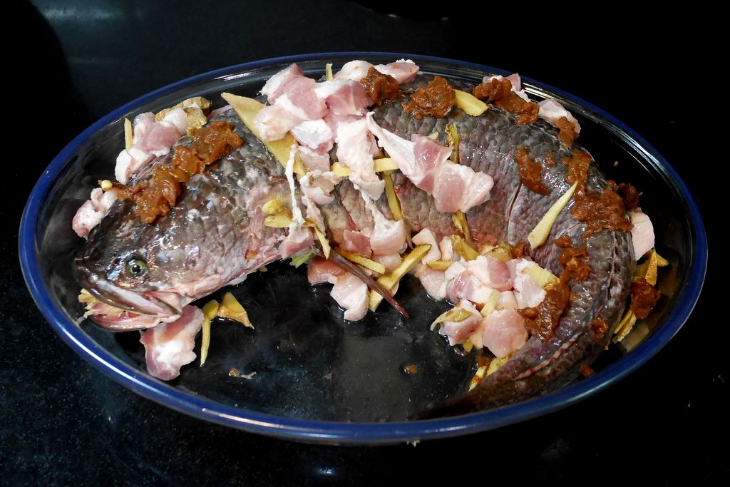 จัดการบั้งปลา นำใส่ในชามใบใหญ่ที่สุดที่หาได้ในบ้าน แต่ปลาตัวใหญ่มากเลยต้องขดตัวปลาไปตามความโค้งของชาม ภาพเลยดูไม่สวย ใส่ หมูสามชั้น บ๊วยดอง และราดด้วยน้ำกระเทียมดอง