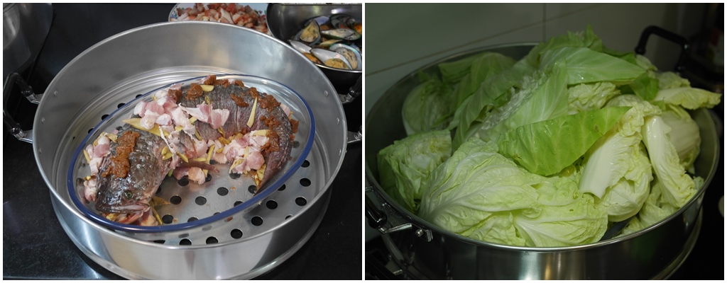 ปลาช่อนตัวใหญ่มาก หนัก 2 กก. ใส่ หมูสามช้น บ๊วยดอง ขิงซอย น้ำกระเทียมดอง พร้อม กะหล่ำปลี ผักกาดขาว นึ่งจนสุก ทานพร้อมน้ำจิ้มทะเล