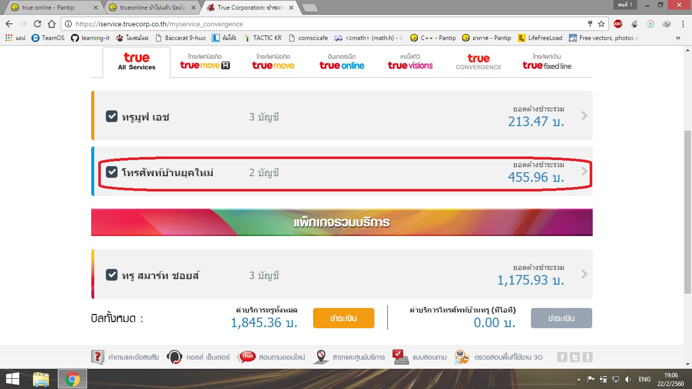คือผมใช้ ทรูสมาร์ทช้อย 799 กำลังจะจ่ายบิล ในส่วนของโทรศัพท์บ้าน อยู่ๆ มีค่าบริการเพิ่มมา 455.96 บาท เลยฝากเช็คทีครับ