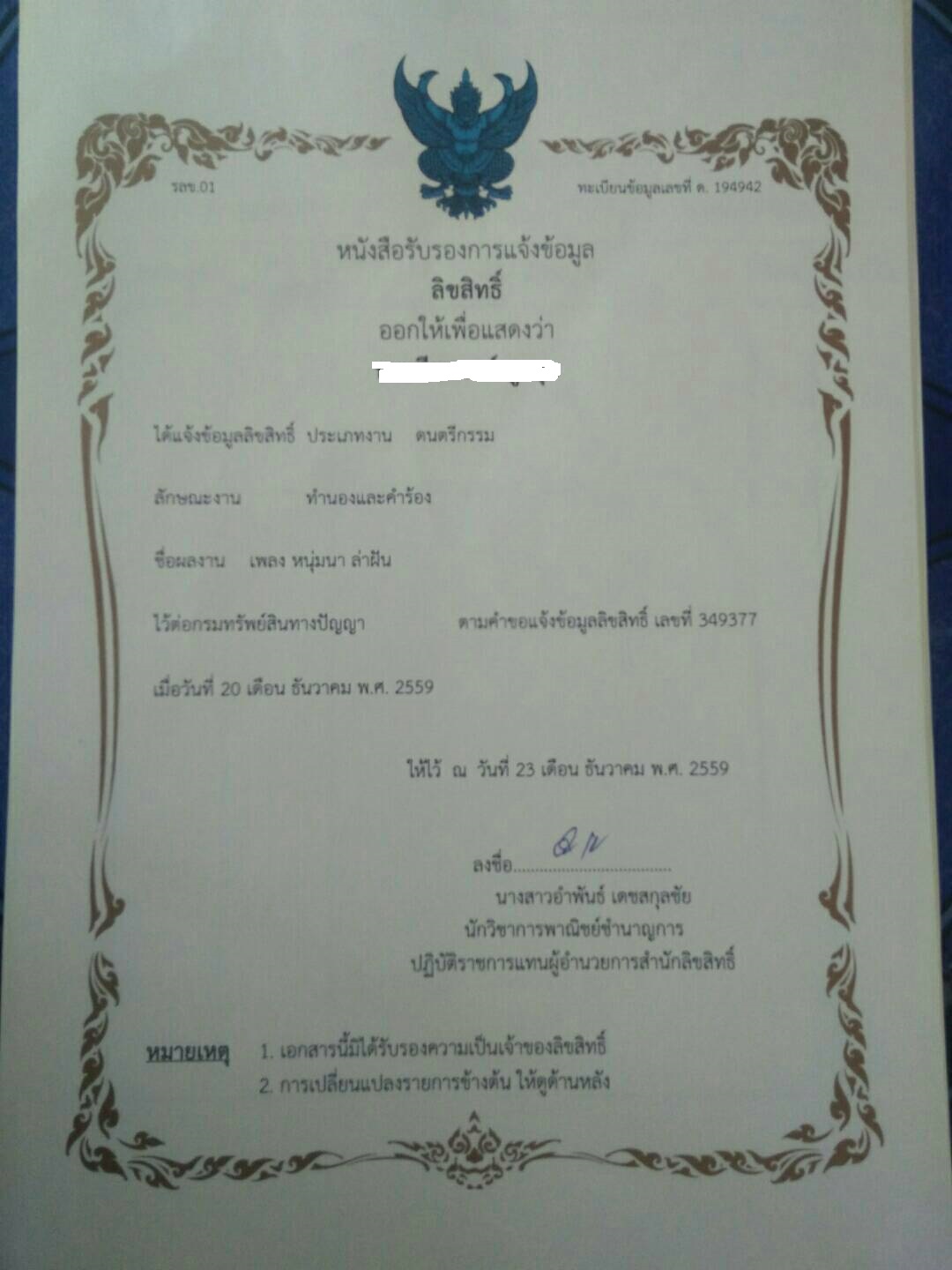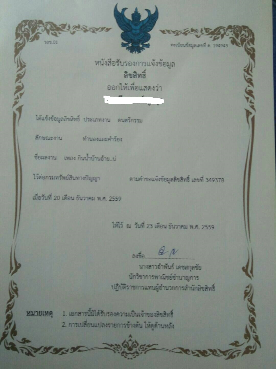 เมื่อไม่นานมานี้ ได้มีคนที่พ่อแต่งเพลงให้ร้อง ด้วยความสนิทสนมกันนำเอาเพลงไปจดลิขสิทธิ์ในชื่อของตัวเอง แถมยังส่งเอกสารมาให้เราด้วย