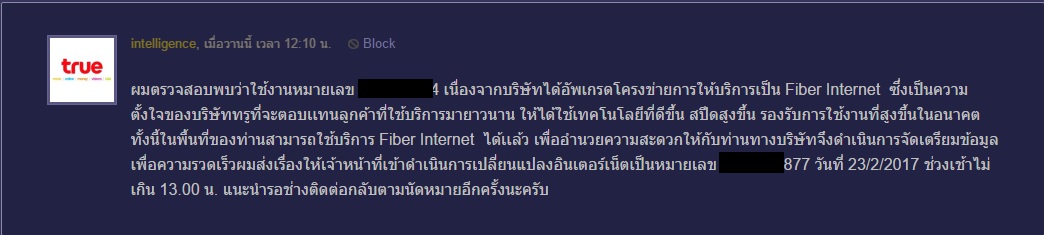 ขอบคุณคุณ Intelligence กับ True Online ที่บริการรวดเร็วทันใจ
