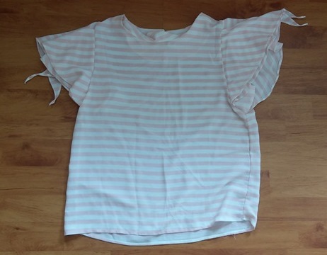 9. เสื้อลายทางครีม - ชมพูอ่อน แขนระบาย ผูกโบวเล็ก ๆ ที่แขนหรือไม่ผูกก็ได้ค่ะ อก 37 นิ้ว