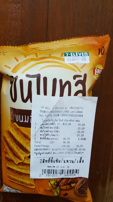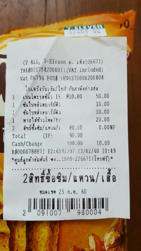 ไปซื้อปลาเส้นให้แมวที่เซเว่นเทิง แล้วเหลือบไปเห็นขนมซองวางขายเลหลังอยู่ ซองละ 7 บาทเลยซื้อมาลองกินสองซอง กลับมาถึงบ้าน ล้วงกระเป๋าเงินจะเอาวางที่โต๊ะ ใบเสร็จเซเว่นปลิวตกมาด้วย เลยหยิบแว่นสายตายาวมาส่องดู ไหนบอกว่า 7 บาท คิดเงินตั้ง 10 บาท จะกลับไปทวงก็ไม่คุ้มกับน้ำมันรถยนต์ แหม หากินเศษกินเลยแบบนี้ไม่ดีนะครับเซเว่น