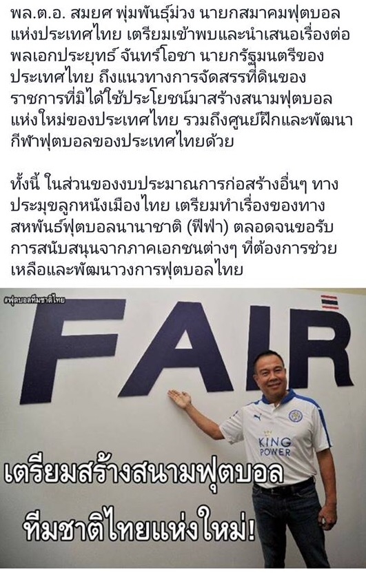 # ___________ สมาคมกีฬาฟุตบอลแห่งประเทศไทยฯ เจรจาบรรลุข้อตกลงกับ กลุ่มบริษัท คิง เพาเวอร์ ในการสนับสนุนการก่อสร้างศูนย์ฝึกฟุตบอลแห่งชาติ ที่ อำเภอ มวกเหล็ก จังหวัด สระบุรี ทั้งหมด การเจรจาในครั้งนี