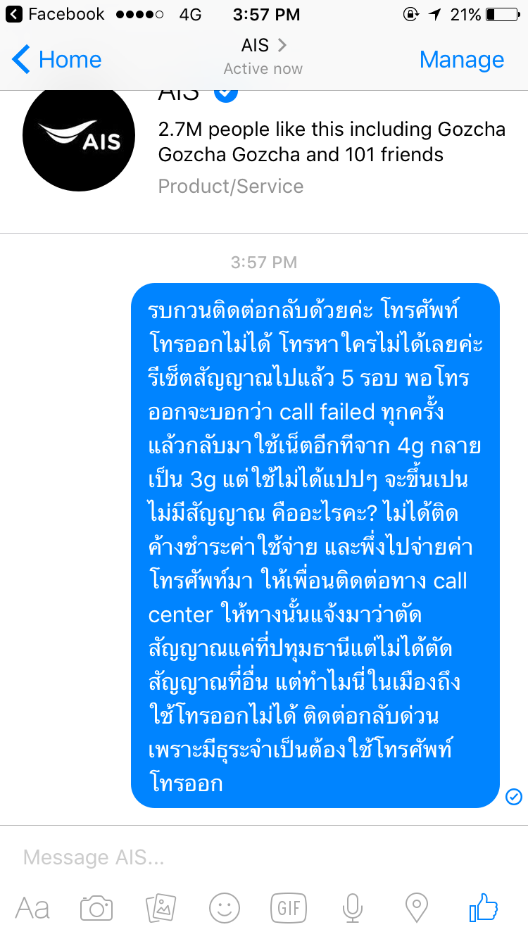 ขอคำตอบจาก Ais ด้วยค่ะ เพราะว่าตั้งแต่เวลา 14.52 น. ใช้โทรศัพท์โทรออกไม่ได้ ลองรีเซ็ตแล้วก้อยังไม่ได้แต่ใช้ Internet ได้เป็นปกติ แต่ตอนโทรออกแล้วกลับมาใช้เน็ตจาก 4G กลายเป็น 3G และหลังจากนั้นจะขึ้นไม่มีสัญญาณต้องรีเซ็ตเครื่องโทรศัพท์ใหม่ ถึงจะใช้เน็ต 4G ได้เหมือนเดิม