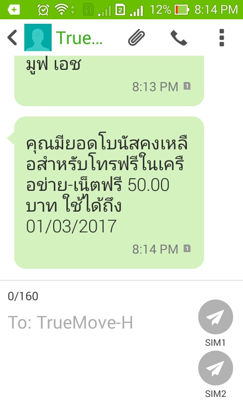 เนื่องจากได้รับ SMS เมื่อประมาณสัปดาห์ที่แล้วว่าถ้าเติมเงินครบ 50 บาท จะได้โบนัสค่าโทรและเน็ต ตอนแรกไม่ได้สนใจอะไร เมื่อวานเติมเงินไป 50 บาท มีข้อความเข้ามาว่า ได้โบนัสค่าโทรและเน็ต 50 บาท ใช้ได้ถึงวั