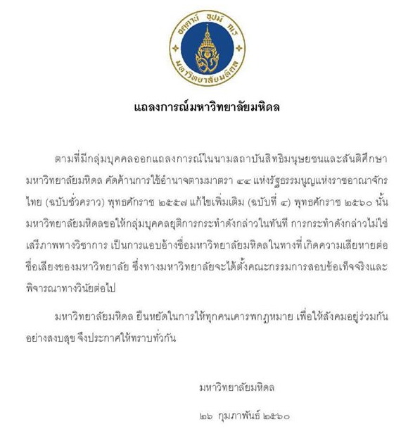 มหาวิทยาลัยมหิดล ยืนหยัดในการให้ทุกคนเคารพกฎหมาย เพื่อให้สังคมอยู่ร่วมกันอย่างสงบสุข จึงประกาศให้ทราบทั่วกัน