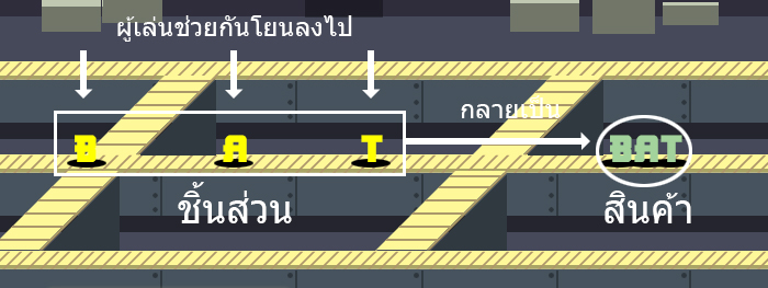 จากภาพ ผู้เล่นโยนชิ้นส่วน (B, A, T) ลงไปบนสายพาน สามารถรวมกันเป็นสินค้า (Bat) ได้
