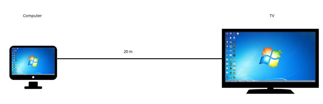 เหมือนตัวอย่างในรูปครับ คือ คอมพิวเตอร์ กับ ทีวี ห่างกันประมาณ 20 เมตร