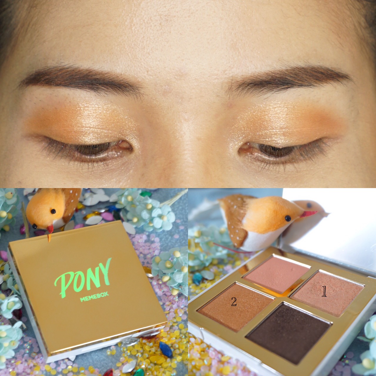 ทาอาแชโดว์ของpony memebox โดยใช้สีที่1และสีที่2 ทาอย่างล่ะครึ่งแล้วเบรนทั้ง2สีเข้าหากัน