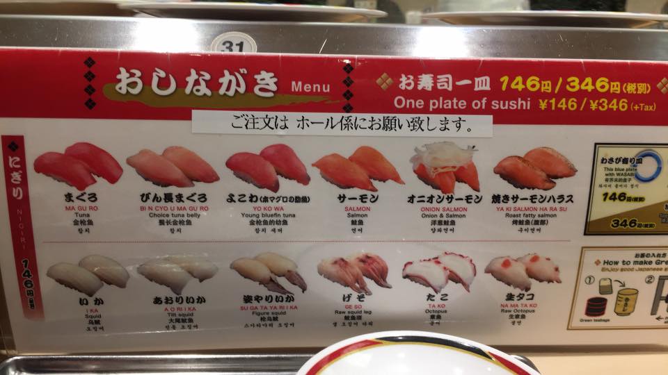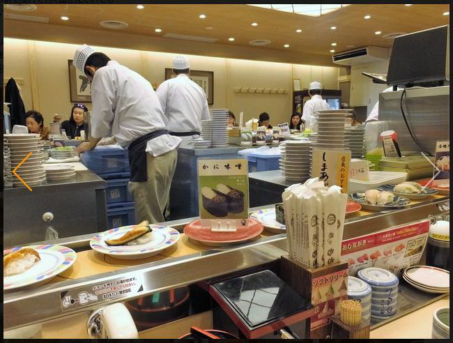 ราคาอาหารให้มีสองราคาเท่านั้นโดยดูจากจานของซูชิที่ส่งมาทางสายพาน จานสีขาวราคา146เยน ส่วนสีน้ำเงินจะ346เยน พวกที่เป็นจานสีขาวก็จะเป็นพวกปลาดิบทั่วไปพวกทูน่า ส่วนจานสีน้ำเงินก็จะเป็นของดีหน่อยเช่นไข่หอยเม่น ปลาไหล เป็นต้น