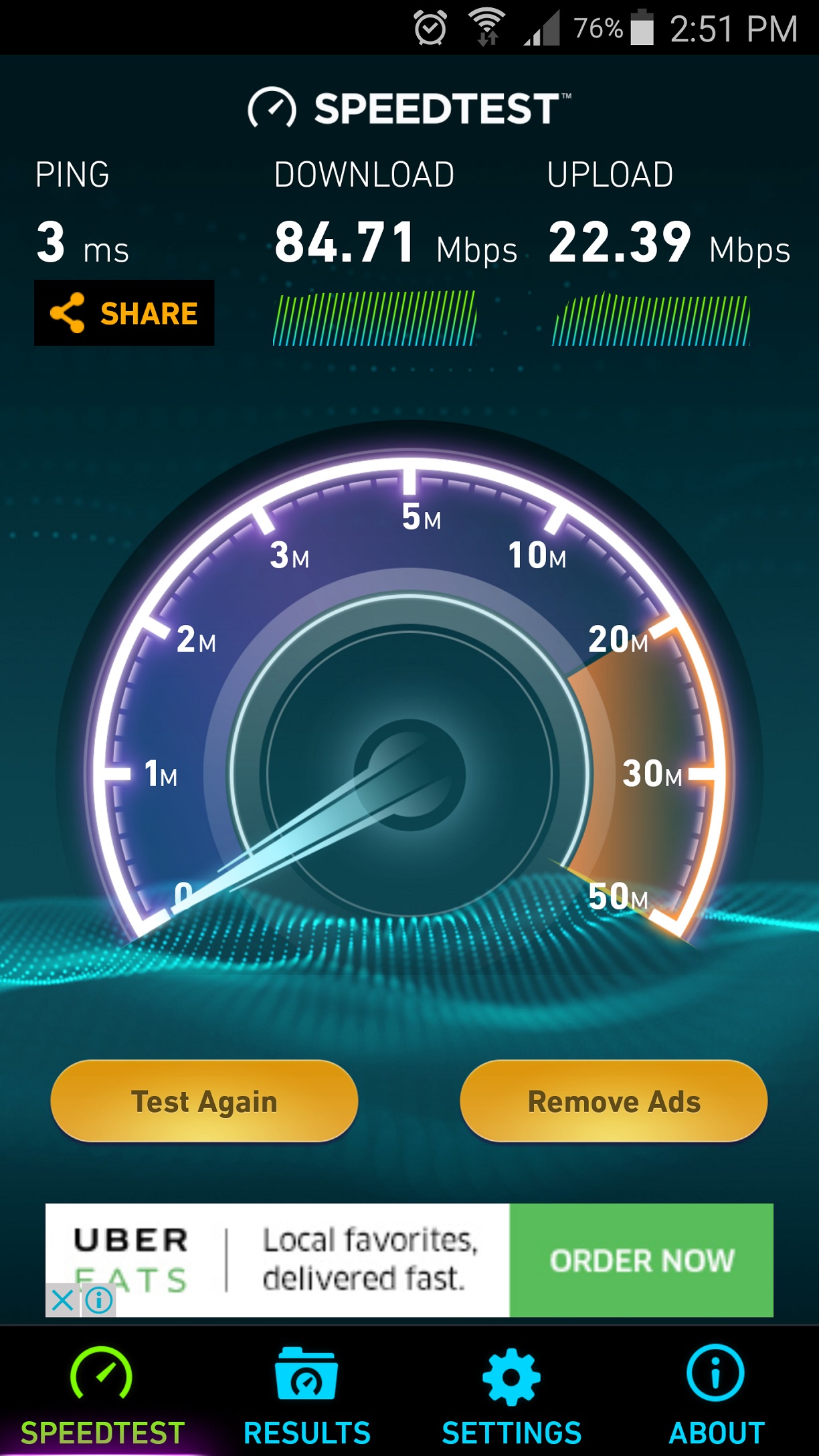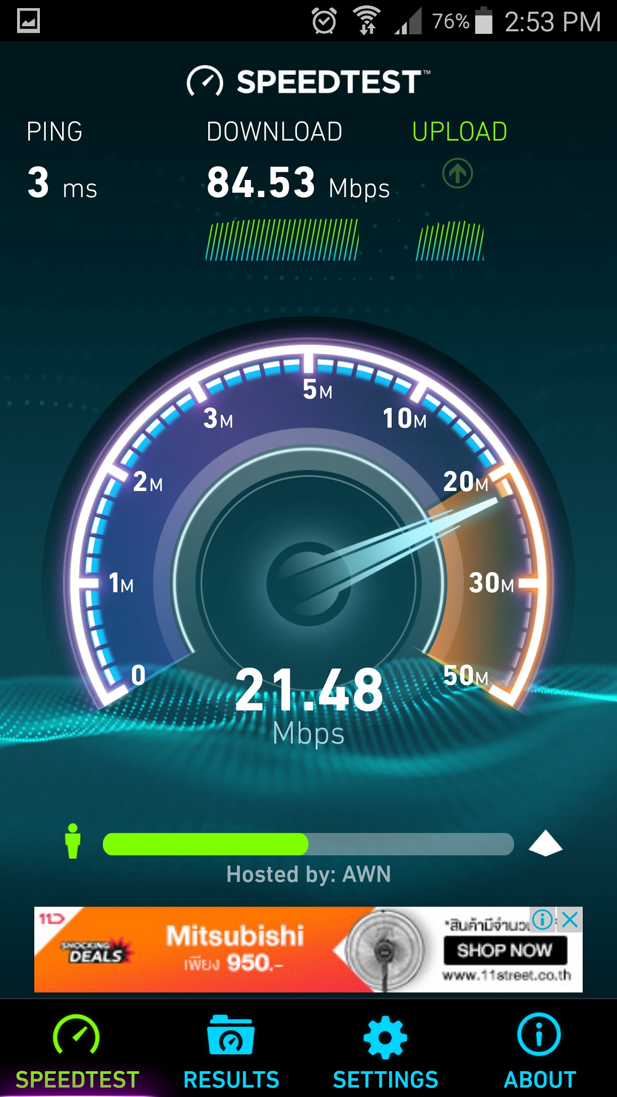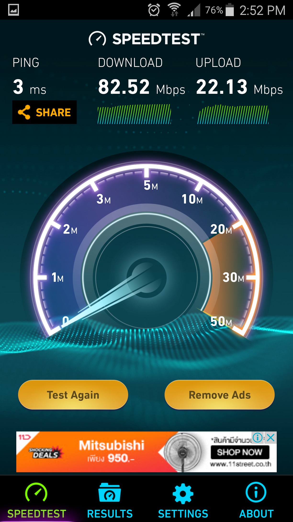 ผล Speedtest ของ TOT Fiber2you วันนี้ประมาณเกือบบ่ายสาม จำนวน 3 คร้ัง จากโปร 80/20 Mb ใช้ Accesspont ของ Edimax ที่ทาง TOT ให้ยืมมา โดยใช้ WIFI ความถี่ 2.4 Mhz