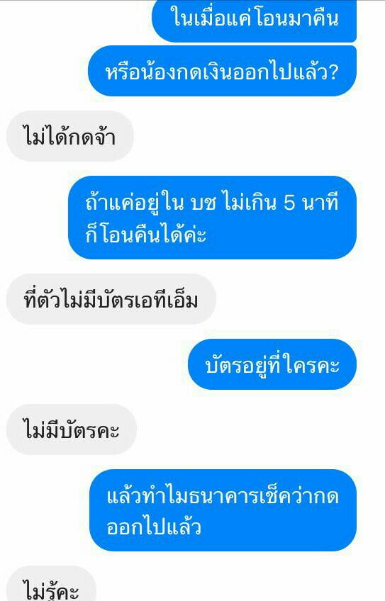 (ถ้าอยู่เชียงใหม่ คือต้องไปถึงนั่นเลยหรอ?) แล้วก็เช็คให้บอกเจ้าของบัญชีที่รับโอนอยู่สาขาเดอะมอลล์ท่าพระ หนูก็รีบไป พอไปถึง ก็แจ้งพนักงานและรอคิว พอเค้าเรียกก็เข้าไปแจ้งจุดประสงค์ของหนู และเล่าเหตุการณ์ให้ฟัง พนักงานหายไปสักพัก กลับมาพร้อมคำตอบที่ว่า...."ไม่สามารถทำอะไรให้ได้เลย" แม้กระทั่งอายัดเงินจำนวนที่หนูโอนไปทั้งๆที่ฝั่งเรามีหลักฐานการโอน และแม้แต่ตรวจสอบว่าเงินถูกกดออกไปรึยังก็ไม่ทำให้ ให้เหตุผลว่าทำได้ แต่บอกหนูไม่ได้!!! และบอกให้หนูกลับไปหาตำรวจ เพื่อให้ทางตำรวจออกเอกสารที่มีตราครุฑ และให้ตำรวจที่ยศ พันตำรวจขึ้นไปเซ็นกำกับ ย้ำ!!! ว่าต้องเป็นพันตำรวจขึ้นไปถึงเซ็นได้ (แล้วถ้าตำรวจ ยศพันตำรวจ ติดราชการ ไม่อยู่ล่ะ?) ?????? คือไม่ทำอะไรให้เลย ทั้งๆที่มีเลขบัญชี ชื่อ และเป็นสาขานี้ด้วย!!!